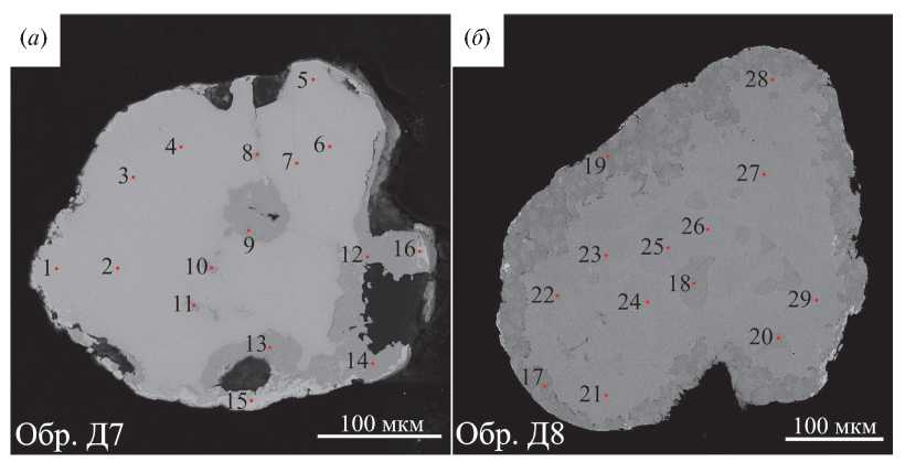 Fig. 8. Heterogeneous gold grains from placer deposit of the Dunitovaya River: (а) sample D7, (б) sample D8. Points with numbers 1–29 denote areas of electron microprobe analyses (EMPA) corresponding to the same numbers in Table 4. (Au, Ag) – electrum, Au – native gold, AuCu – tetraauricupride, Cu3Au – auricupride. BSE images.