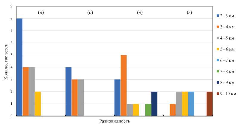 Fig. 9. Histogram of transport distance values (km) from bedrock source for gold grains of drop-shaped-rounded (а), lumpy (б), flattened-lumpy (в) and lamellar (г) varieties from placer deposit of the Dunitovaya River.