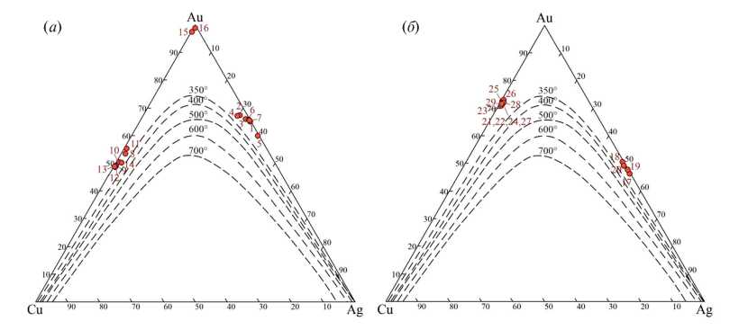 Рис. 10. Состав полиминеральных ассоциаций зерен золота Д7 (а) и Д8 (б) из россыпи р. Дунитовой на диаграмме Au-Cu-Ag. На диаграмму нанесены изотермы тройного твердого раствора по экспериментальным данным (Дриц и др., 1979). Точки с цифрами 1–29 – места проведения рентгеноспектральных микроанализов, соответствующие таковым номерам в табл. 4.