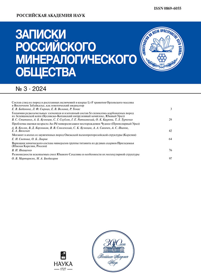 Titanite, aluminium- and fluorine-enriched titanite, tin-bearing titanite and malayaite from ore skarns in the Ladoga Lake region were studied. Composition of these minerals from skarns with W-Zn-Pb-Bi (Latvasyrja, Jokiranta) and Sn-Zn-Cu-Fe-In (Pitkäranta Mining District) mineralization, related genetically to S-type and А-type granites, was analyzed. For the first time for ore deposits and occurrences in Karelia, there was detected titanite enriched in aluminum (Al2O3 5—7 wt%) and fluorine (~3 %). Isomorphic substitutions in titanite from skarns with different metallogenic specialization were considered. It is shown that the following isomorphic schemes are realized for studied titanite: (Al, Fe)3+ + F– ↔ Ti4+ + O2–; (Al, Fe)3+ + (OH)– ↔ Ti4+ + O2–, where Al ≥ Fe (skarns with W-Zn-Pb-Bi mineralization); and Sn4+ ↔ Ti4+ (skarns with Sn-Cu-Fe-Zn-In mineralization). The Sn-bearing titanite from Sn-bearing skarns nearly in all cases contains Fe, what it seems due to the high Fe# in rapakivi granites (containing biotite and other mafic minerals with Fe# >0.9) and the associated post-magmatic mineralization (columbite-(Fe), synchysite-(Fe), marmatite). The formation of titanite enriched in aluminum and fluorine was controlled by protolith and fluid compositions rather than temperature and pressure (≤500 ◦C, ≤5 kbar). Crystallization of this titanite in Jokiranta ore occurrences took place during a post-ore-forming process, potentially capable to the remobilization of base-metals ores.