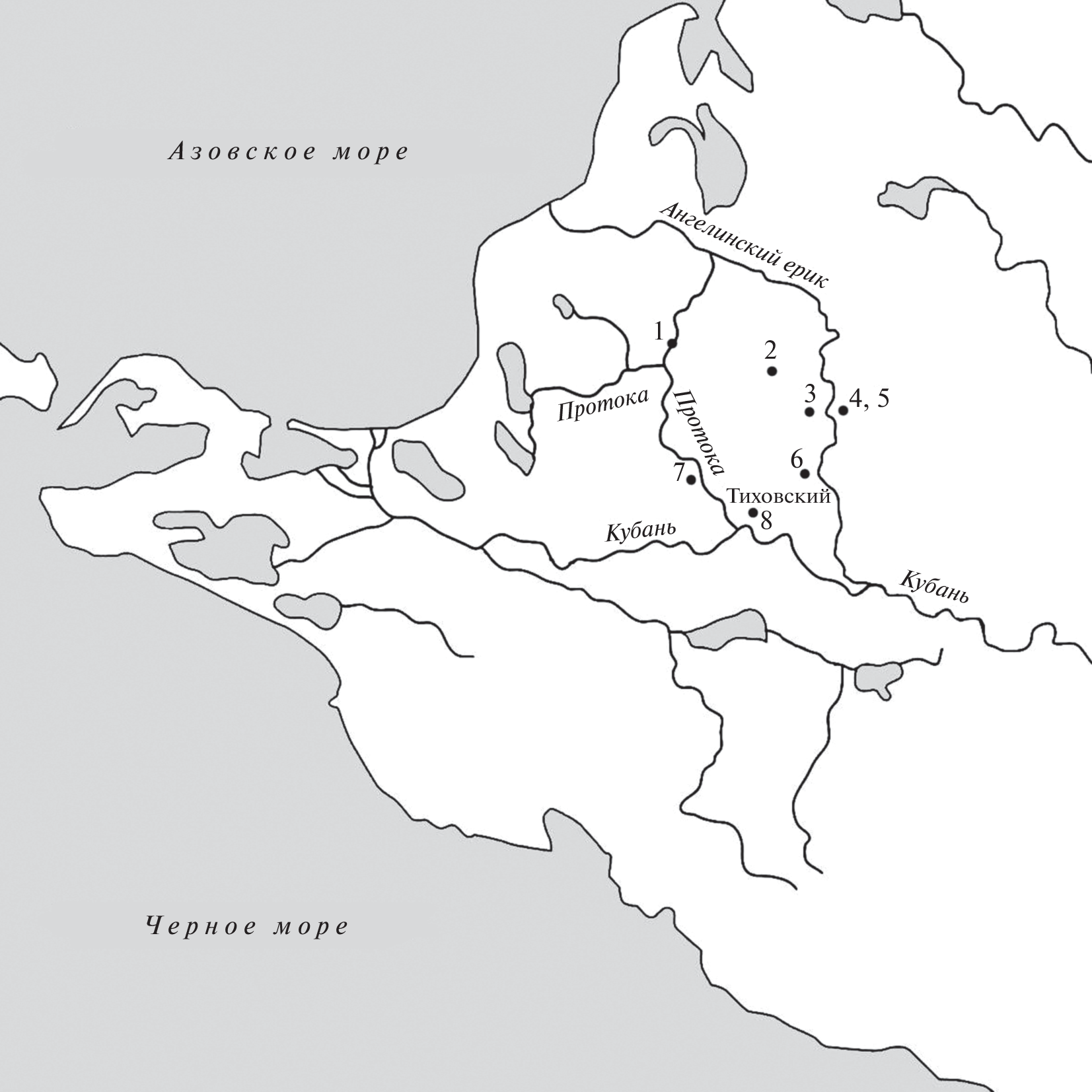 The paper presents a hoard of the early third-century BC Panticapaeum bronze coins, found during excavations at the Maeotian settlement of Tikhovsky 1, Krasnoarmeisky district of Krasnodar Territory, in 2021. The hoard contains 152 coins with “Pan / lion head, below sturgeon” bearing countermarks of a star and a bowcase. In the interfluve of the Kuban, Protoka and Angelinsky Erik, a group of Maeotian settlements is located, which is associated with a pattern of similar coin hoards concealed at the turn of the 4th and 3rd centuries BC. These hoards indicate the easternmost border of the Bosporan kingdom and localize the Maeotian territories annexed during the Bosporan expansion to the east.