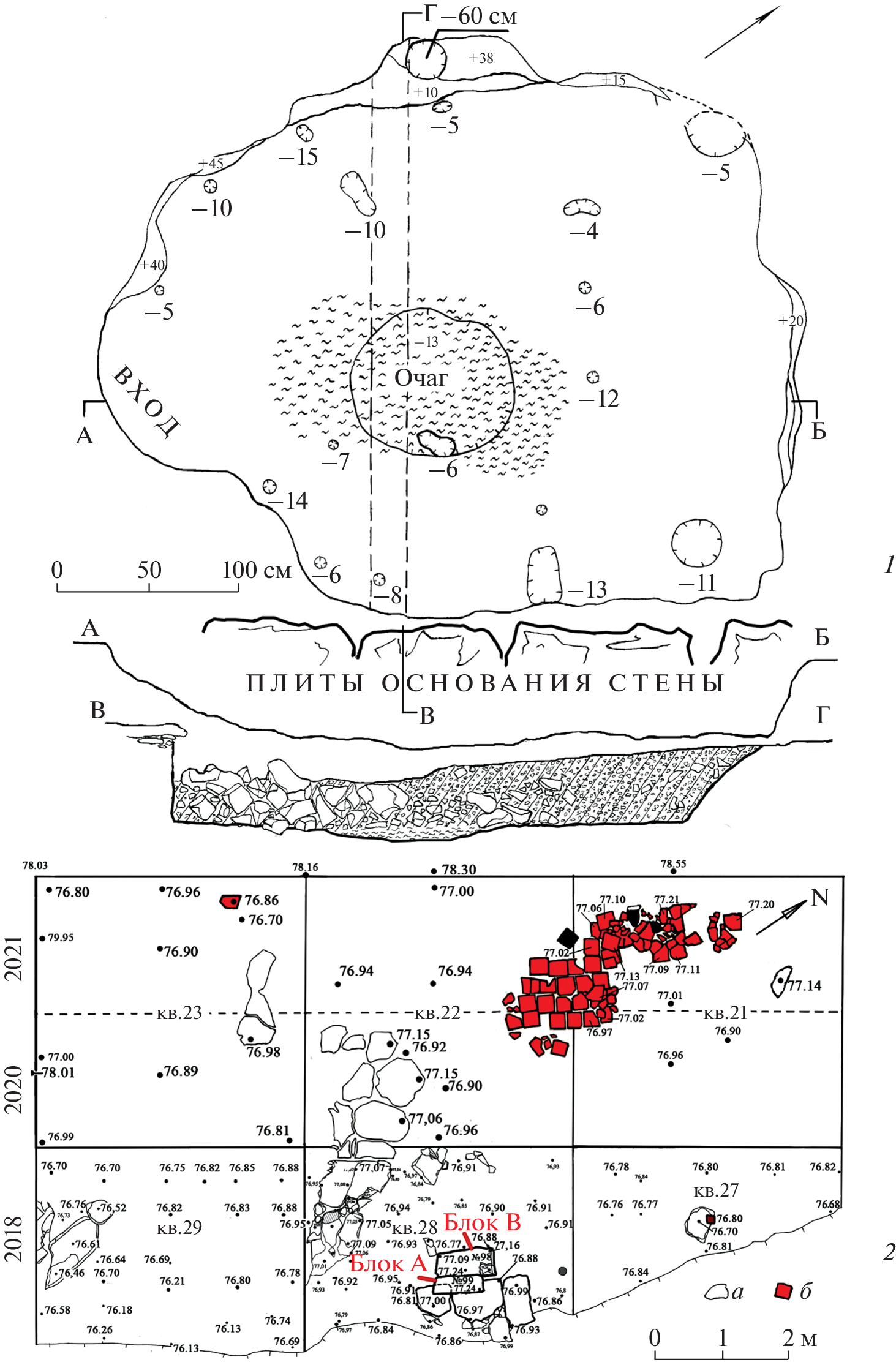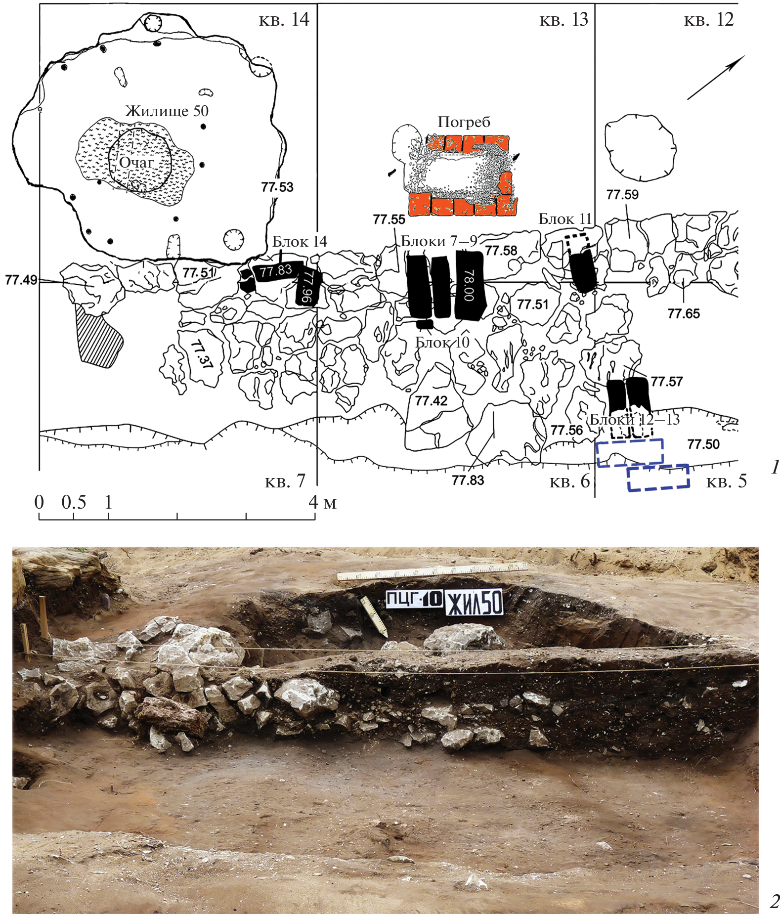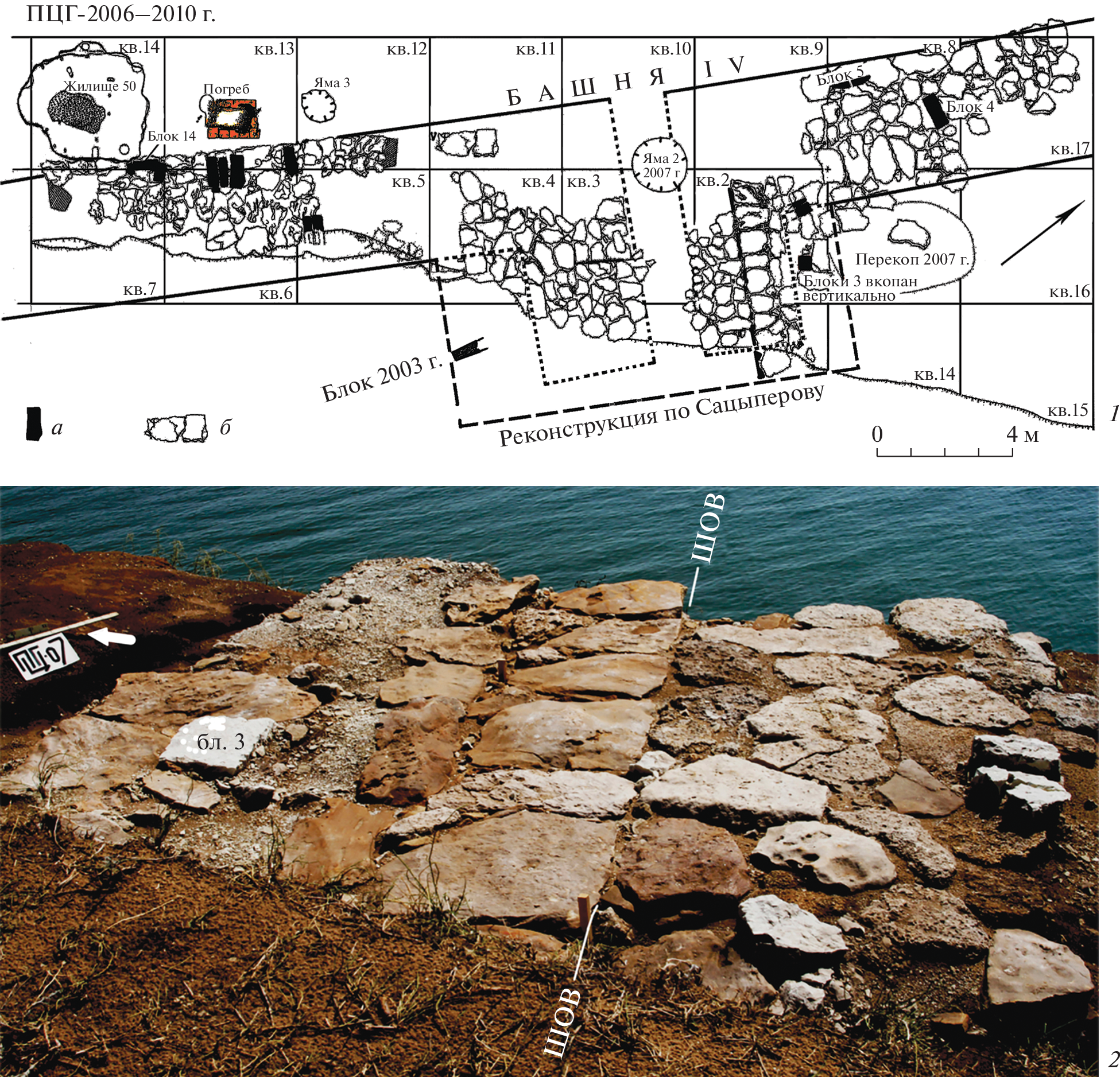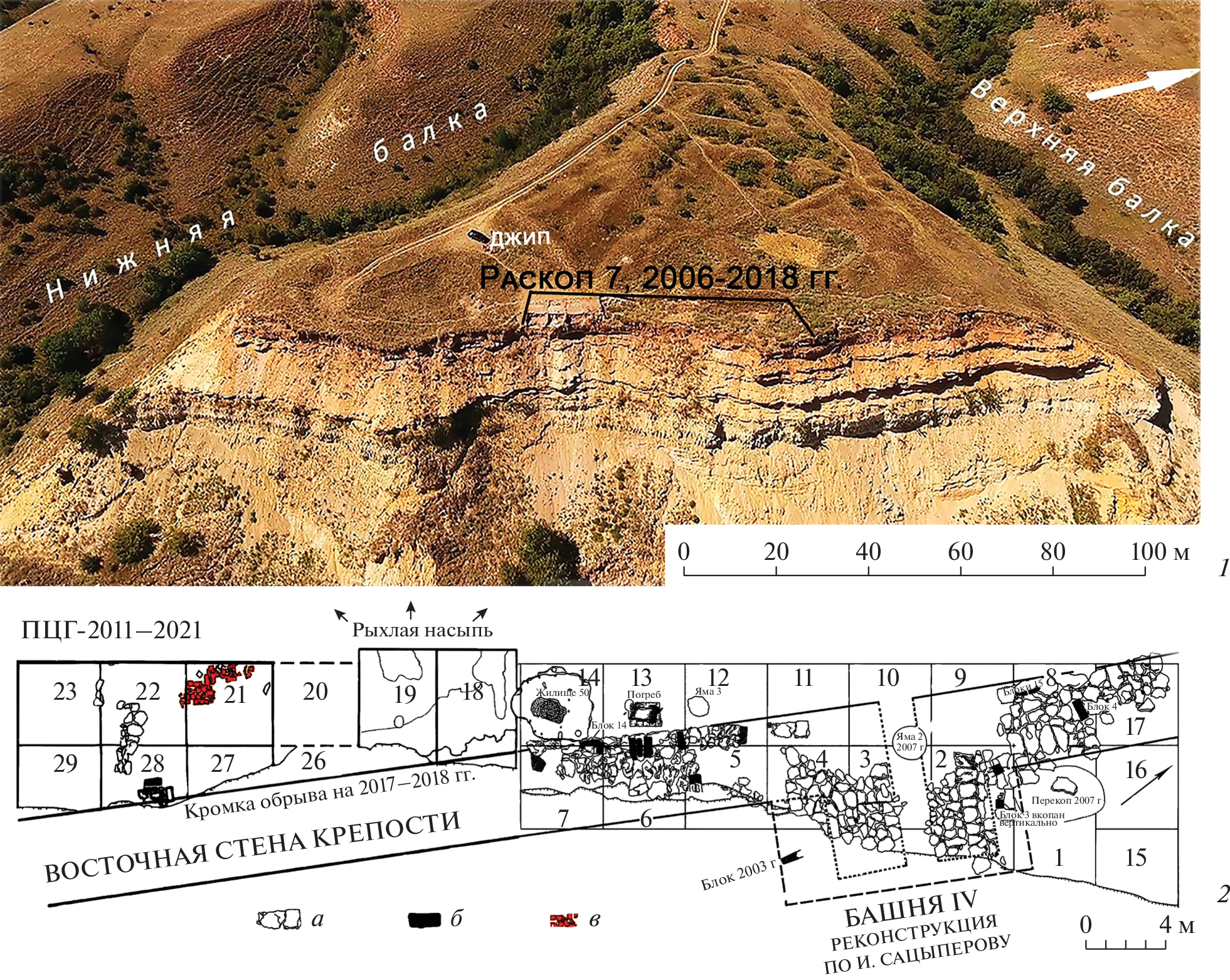 The right-bank Tsimlyansk settlement is a white-stone fortress doomed to destruction by the construction of the Tsimlyansk reservoir. The estimates of experts in bank transformation show that the fortress will disappear in the next 75 years, while the bank stabilization will take 200 years or longer. The paper presents the results of the 2006–2021 excavations along more than 56 m of the eastern fortress wall and in tower IV which were built from white limestone blocks laid on a base of shell rock and sandstone slabs. No wooden posts under the wall were found, as in the case of the southern corner of the fortress. The location of the tower corresponds to the 1743 plan by I. Satsyperov. Two options for its reconstruction are proposed. A unique feature of many blocks is the decoration in the shape of a straight and oblique grid. A number of building materials of Byzantine origin were found, including roof tiles and kalypters, as well as ceramic tiles. Another yurt dwelling (structure no. 50) typical for the fortress was uncovered. It is of fundamental importance that the dwelling adjoins the inner face of the fortress wall. Earlier, two more dwellings were found near the inner facade, but none has been found under the wall. This circumstance casts doubt on S.A. Pletneva’s hypothesis unsupported by M.I. Artamonov about the existence of an earlier settlement on the site of the fortress.