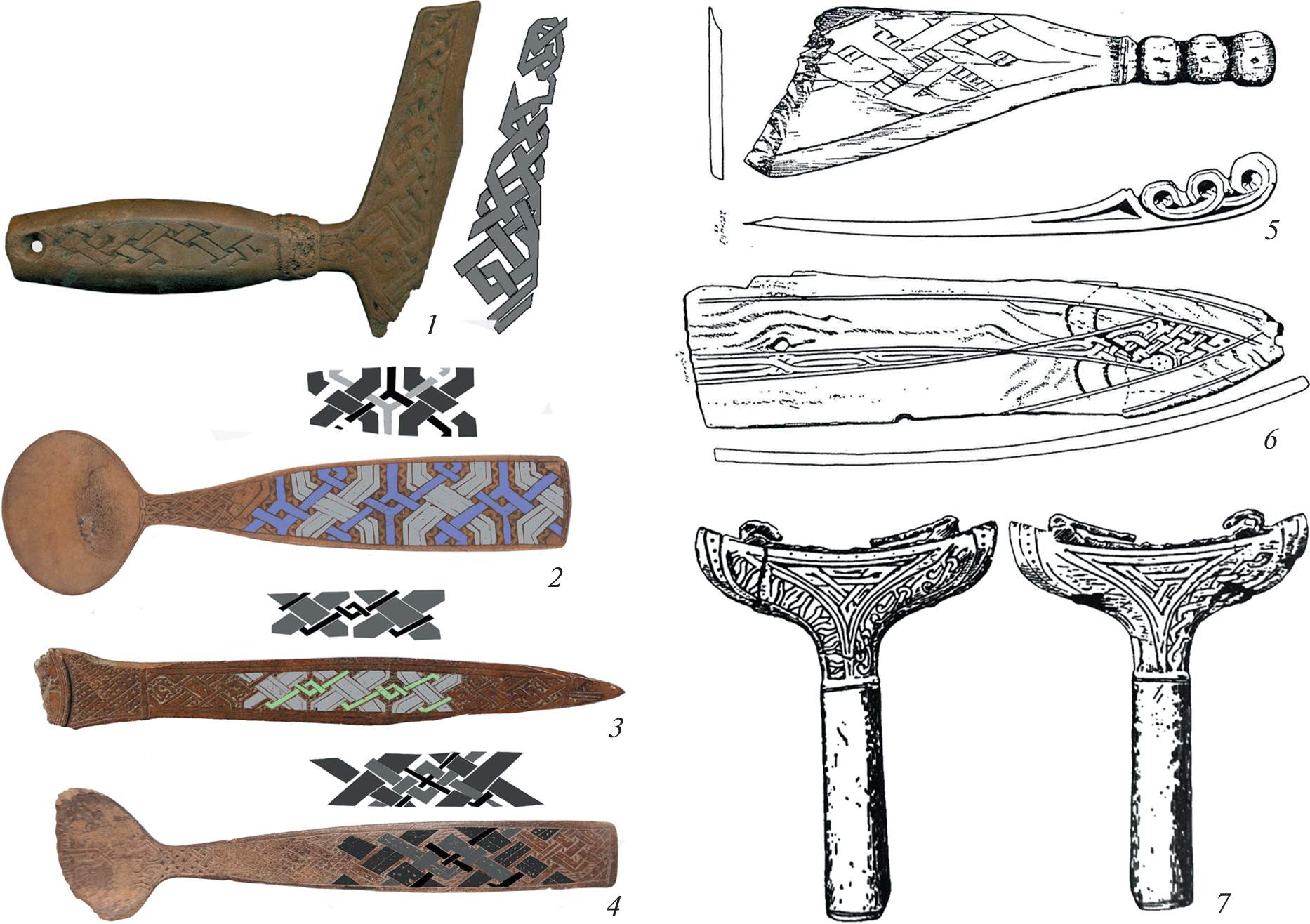 The article deals with comprehensive study of four horn spoons from the early strata of Troitsky and Nerevsky excavation sites from Veliky Novgorod. The main hallmark distinguishing these artefacts among analogies is highly artistic geometric interlaced ornament, which has not been studied fully and is not discussed in Russian historiography. The complex use of archaeological and artistic analysis made it possible to interpret the origins of interlaced ornament in archaeological contexts. The closest typological and stylistic analogies were found in the medieval urban centres of Middle Sweden, on the boundaries of the Scandinavian and Sami cultures. The research prompted an assumption about the North European origin of these spoons from the Novgorod cultural deposit. The ornaments of these artefacts can be regarded as one of the areas of Scandinavian art influenced by Sami tradition.