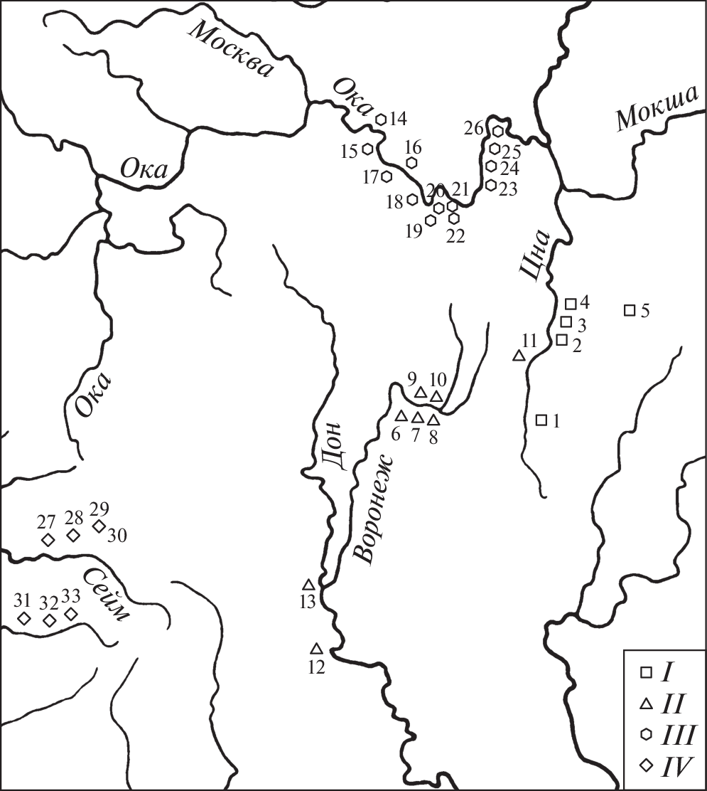 - Oblomskiy A.M., 2012. Early medieval sites of the Upper Don region. Preliminary results of the study. Tambovskie drevnosti. Arkheologiya Oksko-Donskoy ravniny [Tambov antiquities. Archaeology of the Oka-Don Plain], 3. S.I. Andreev, ed. Tambov: Izdatel’stvo Tambovskogo gosudarstvennogo universiteta, pp. 172–229. (In Russ.)