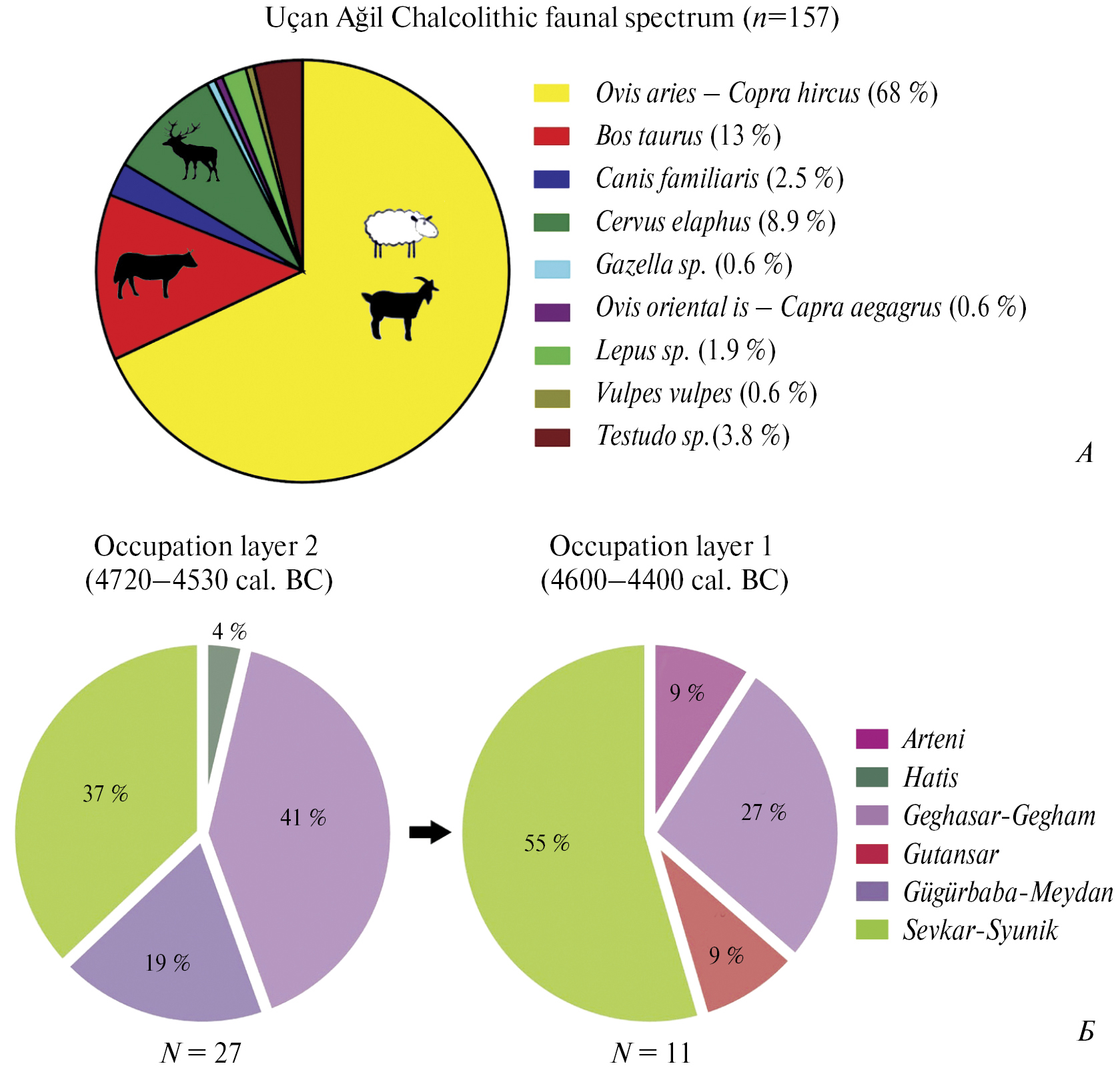 Скотоводство и охота. Ботанические остатки в этих поселениях пока не выявлены. Остеологические же остатки поселений Узуноба и Бюловкая не изучены должным образом. Исследования костей животных из поселения Нахчыван Тепе1 показывают, что их жители в основном разводили мелкий (Ovis aries, Capra hircus) и крупный рогатый скот (Bos taurus) (Baxşəliyev et al., 2018. S. 21). Отметим, что в нижних слоях поселения Нахчыван Тепе преобладают кости мелкого рогатого скота, а в верхних слоях увеличивается процент крупного рогатого скота (рис. 7). Обнаружены также остатки костей собаки (Canis familiaris). В хозяйстве жителей Нахчыван Тепе определенное место занимала также охота. Жители охотились на зайцев (Lepus europaeus), газелей (Gazella sp.), диких лошадей (Equus ferus), диких быков (Bos primigenius) и оленей (Cervus elaphus). Исследования остеологических остатков поселения Учан Агыл показывают, что здесь также занимались скотоводством, основное место в котором занимал мелкий (Ovis aries, Capra hircus) и крупный (Bos taurus) рогатый скот, с преобладанием первого (рис. 8, 1). Поселенцы Учан Агыл охотились на оленей (Cervus elaphus), газелей (Gazella sp.), зайцев (Lepus sp.), муфлонов (Ovis orientalis) и безоаровых козлов (Capra aegagrus).