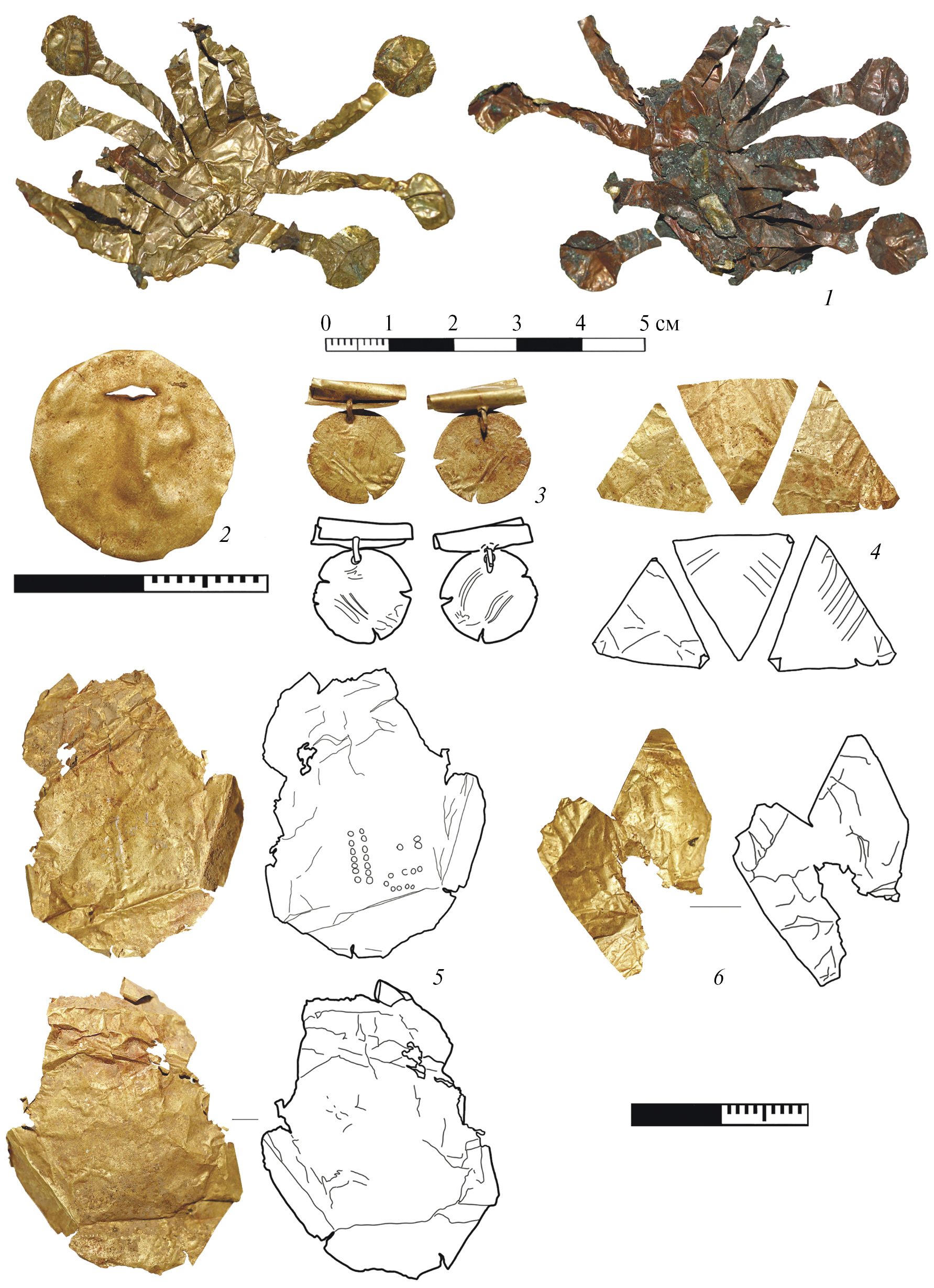 Рис. 5. Детали погребального костюма из заполнения камеры склепа: 1 – сложносоставная брошь с основой в форме “глаза” и подвижными элементами; 2 – медальон-индикация; 3 – подвеска-медальон; 4 – украшения погребального костюма в виде треугольных листков; 5 – лист фольги с декором, выполненным пуансоном; 6 – фрагмент трилистника.