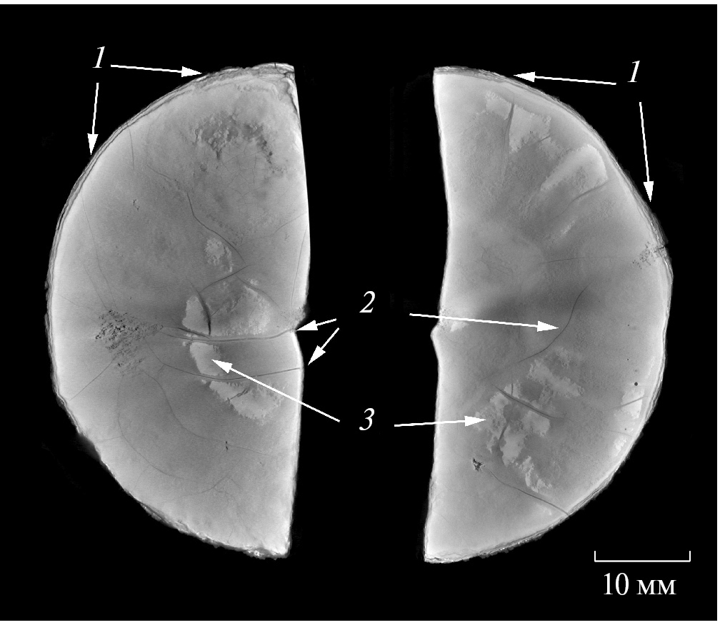 По данным РТ и НТ, на поверхности зеркала находится слой коррозии неравномерной толщины (до 1 мм). Интенсивный коррозионный процесс проходил в несколько стадий: в приповерхностных областях наблюдается растрескивание на слои толщиной от 60 до 270 мкм (рис. 7, 1). По всему объему идет значительное количество радиальных и поперечных трещин шириной до 250 мкм, проникающих в некоторых областях на всю глубину (рис. 7, 2). Регистрируются поры округлой формы диаметром от 90 до 630 мкм, что позволяет исключить проковку предмета после его отливки. Совместный анализ ослабления рентгеновского излучения и тепловых нейтронов позволил выявить области предмета с наилучшей сохранностью – в центральной зоне зеркала и ручки (рис. 7, 3). Следов создания на поверхности изделия дополнительного “зеркального” слоя не обнаружено.