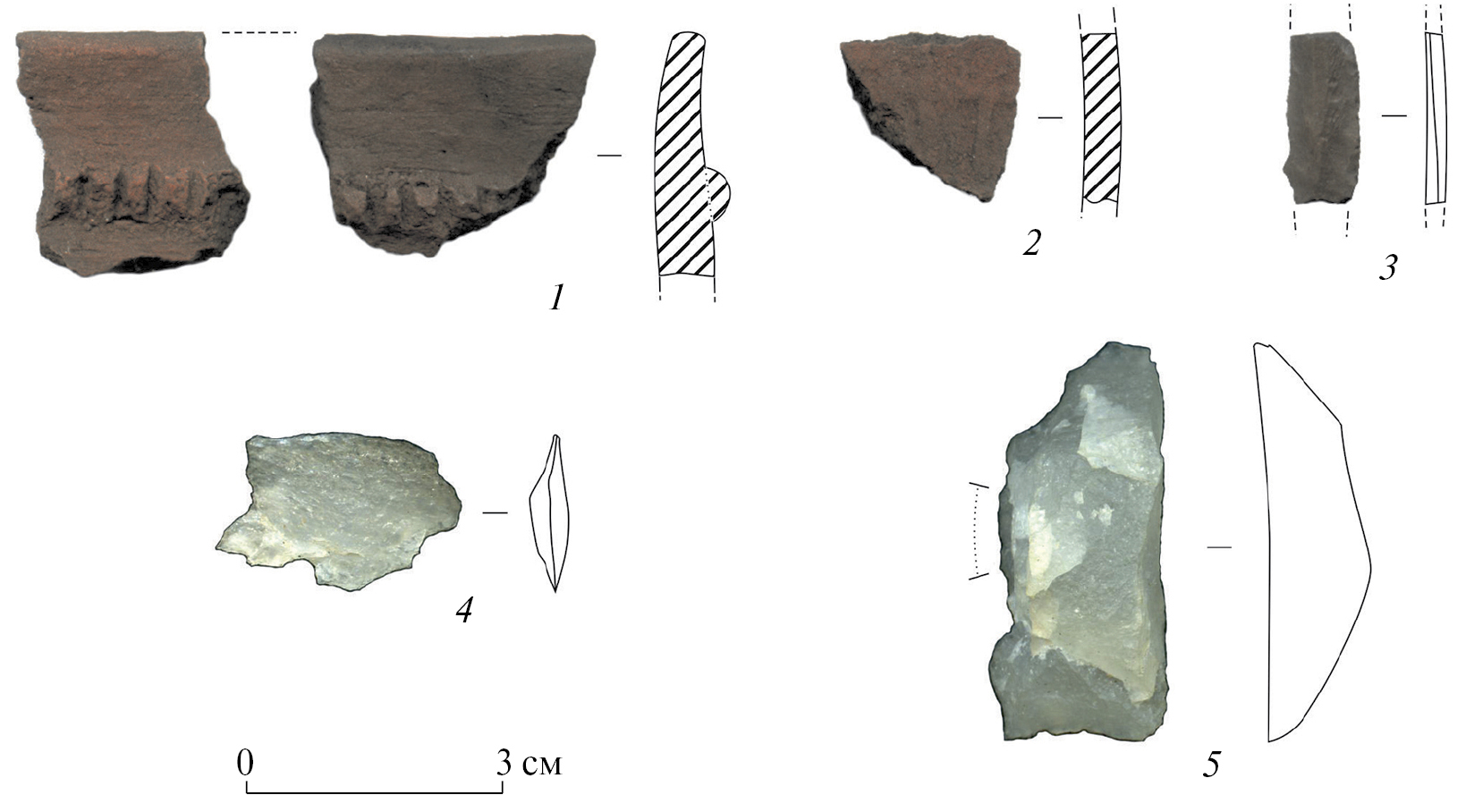 Выявлено два культурных слоя. Первый – на глубине 10–17 см, приурочен к средней части и подошве черной гумусированной супеси. Среди находок – 27 фрагментов гладкостенной керамики, 3 гальки, медиальный сегмент призматической пластины из кремня (рис. 4, 3), 10 фрагментов битой и обожженной кости. Керамика – фрагменты от двух сосудов, один из которых (26 фр.) орнаментирован налепным рассеченным валиком под венчиком (рис. 4, 1), другой (1 фр.) – рядами отступающего прямоугольного орнаментира (рис. 4, 2).