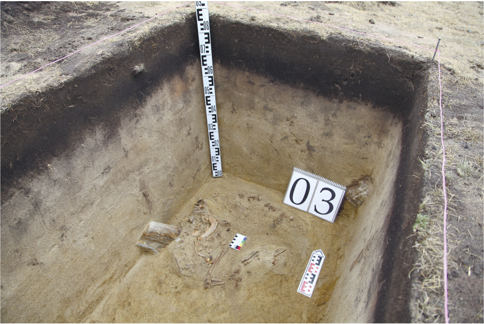 Нижний уровень заполнения ямы. На глубине 77–88 см от дневной поверхности в слое серовато-желтого песка обнаружены остатки собаки практически в анатомическом порядке (рис. 3, 3, 6). Кости скелета сильно разрушены тафономическими факторами, что связано с хорошо аэрируемыми и дренируемыми песчаными отложениями, в которых погребена собака. Череп сильно разрушен, полностью сохранилась лишь правая сторона ростра с зубным рядом и правая ветвь нижней челюсти. В целом среди костей посткраниального скелета лучше сохранились элементы правой стороны тела: кости передних ног (от плечевой до фаланг), шейные позвонки, кости задних ног (от большой берцовой до фаланг), фрагмент лопатки, головка бедренной кости. Сохранились и когтевые фаланги, из чего следует вывод, что шкура с туши не снималась. Вероятно, была захоронена полная туша, о чем косвенно свидетельствует отсутствие позвонков, ребер, диафизов отдельных костей, которые разлагаются от присутствия объемных мягких тканей. Судя по ориентировке отдельных частей скелета, собака была погребена в свернутом “калачом” виде, на правом боку, мордой ориентирована на юг.
