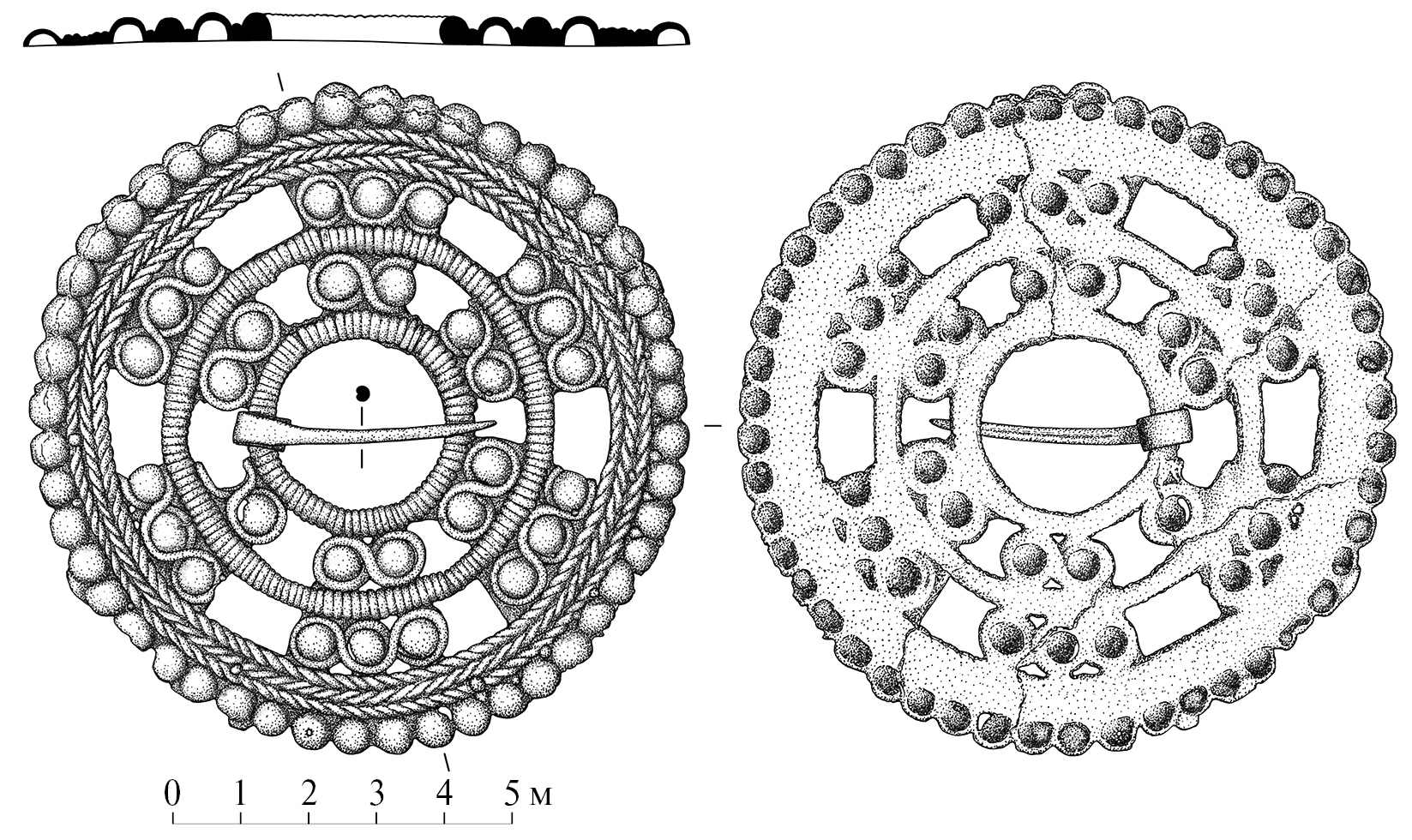 Археологический (типологический) контекст. Структура и орнаментальные мотивы ажурной застежки из клада сочетают признаки изделий разных типов. В первую очередь ее следует соотносить с рязано-окскими застежками серии 2Б, выделенной И.В. Белоцерковской (1999. С. 162). Серия характеризуется наличием следующих элементов: 1) двух колец в основании с “имитацией обмотки”, между которыми расположены сдвоенные “бляшки” с окантовкой или без нее; 2) примыкающим ко второму кольцу таких же сдвоенных или строенных “бляшек”, к которым прикреплены “ложноплетеные” лопасти; 3) перпендикулярных кольцу дротов, редуцированных или отсутствующих.