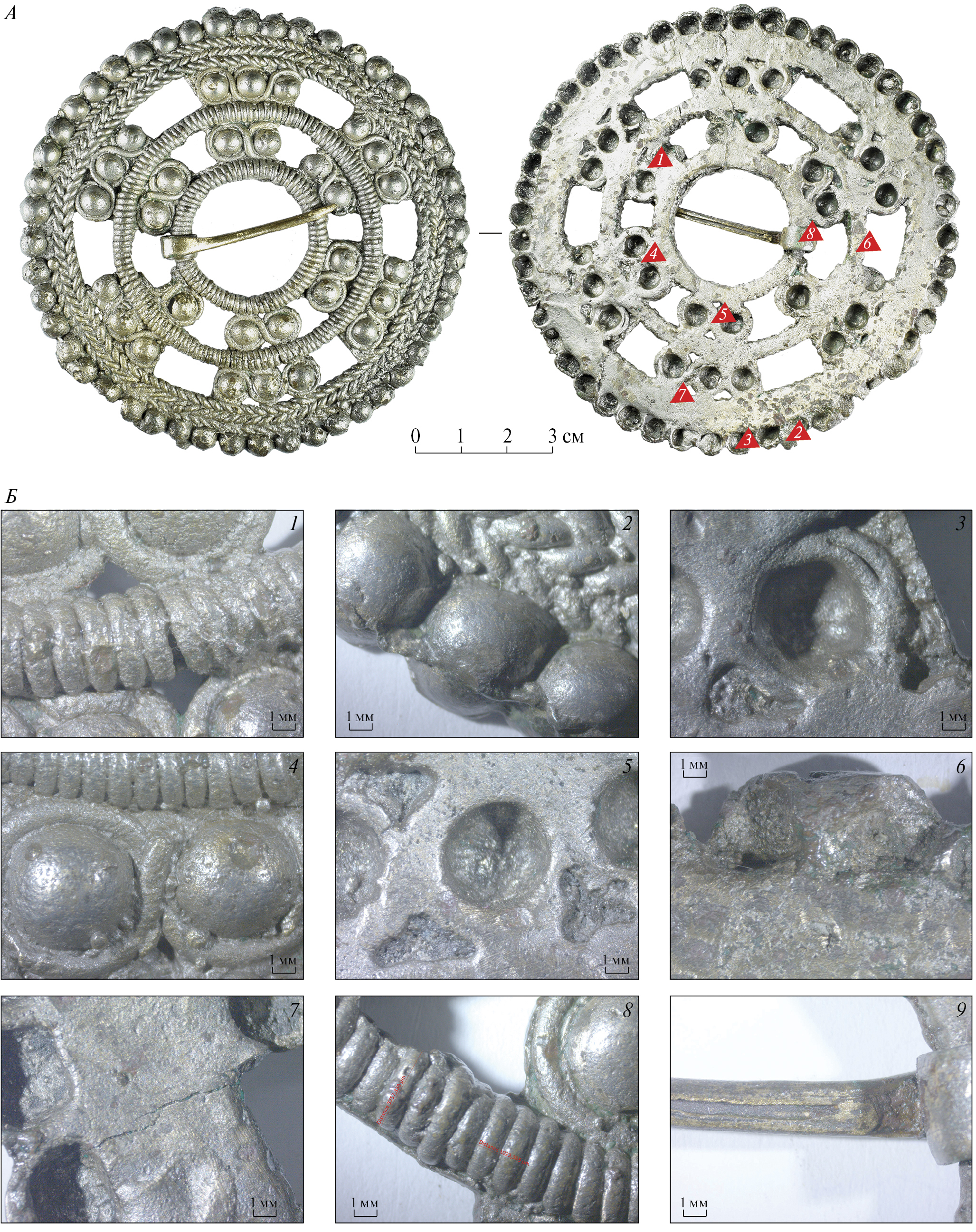 Рис. 2. Фото ажурной застежки (А) и макрофотографии ее деталей (Б). А – 1–8 – точки анализа состава металла.