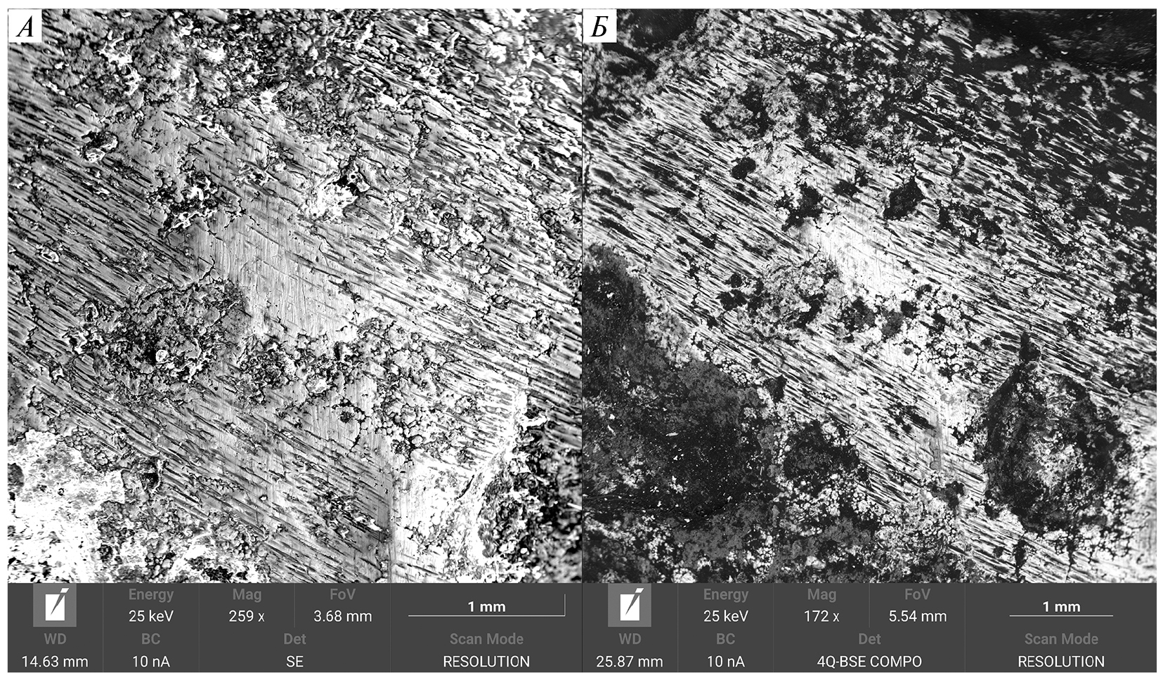 Рис. 3. Макрофотографии (РЭМ) участков застежки с белым «покрытием». А – рельеф поверхности; Б – структура.