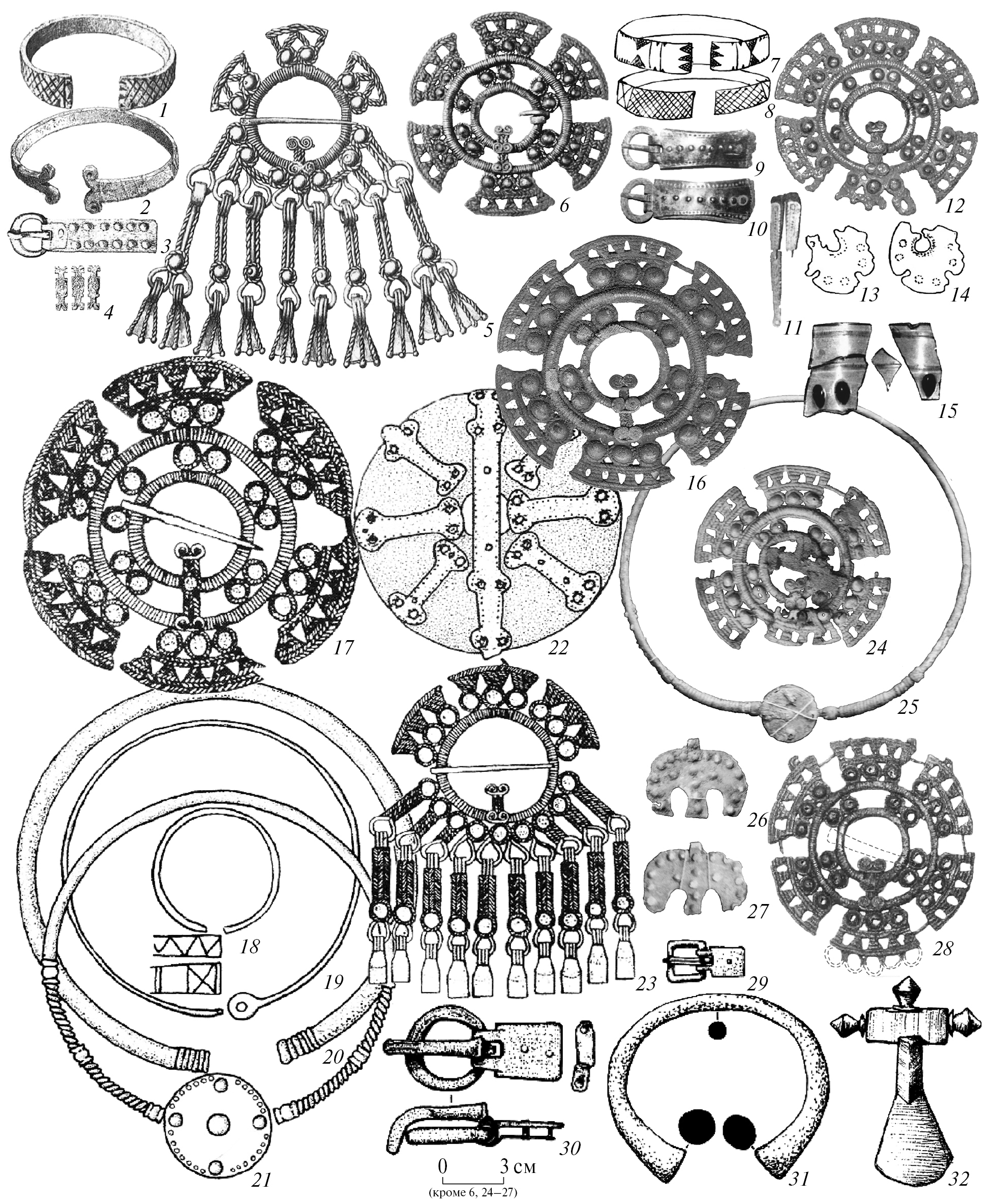 Рис. 4. Ажурные застежки серии 2Б (по И.В. Белоцерковской) со строенными “жемчужинами” и широкими лопастями и характерные предметы комплексов рязано-окских могильников. Борки: 1–6 – п. 107; 16 – п. 8; 24–27 – п. 95; Ундрих: 7–15 – п. 49; Борок 2: 17–23 – п. 222; Никитино: 28–32 – п. 14. 1–5 – по: Спицын, 1901; 6, 24–27 – по фотографиям планшетов с находками, Рязанский историко-археологический музей-заповедник (РИАМЗ), КП-21996; 7–15 – по: Гаврилов, Семенов, 2023; 16 – по фото от Д.А. Иванова, РИАМЗ, КП-1388/251, А 208; 17–23 – по: Белоцерковская, 2014; 28–32 – по: Воронина и др., 2005.
