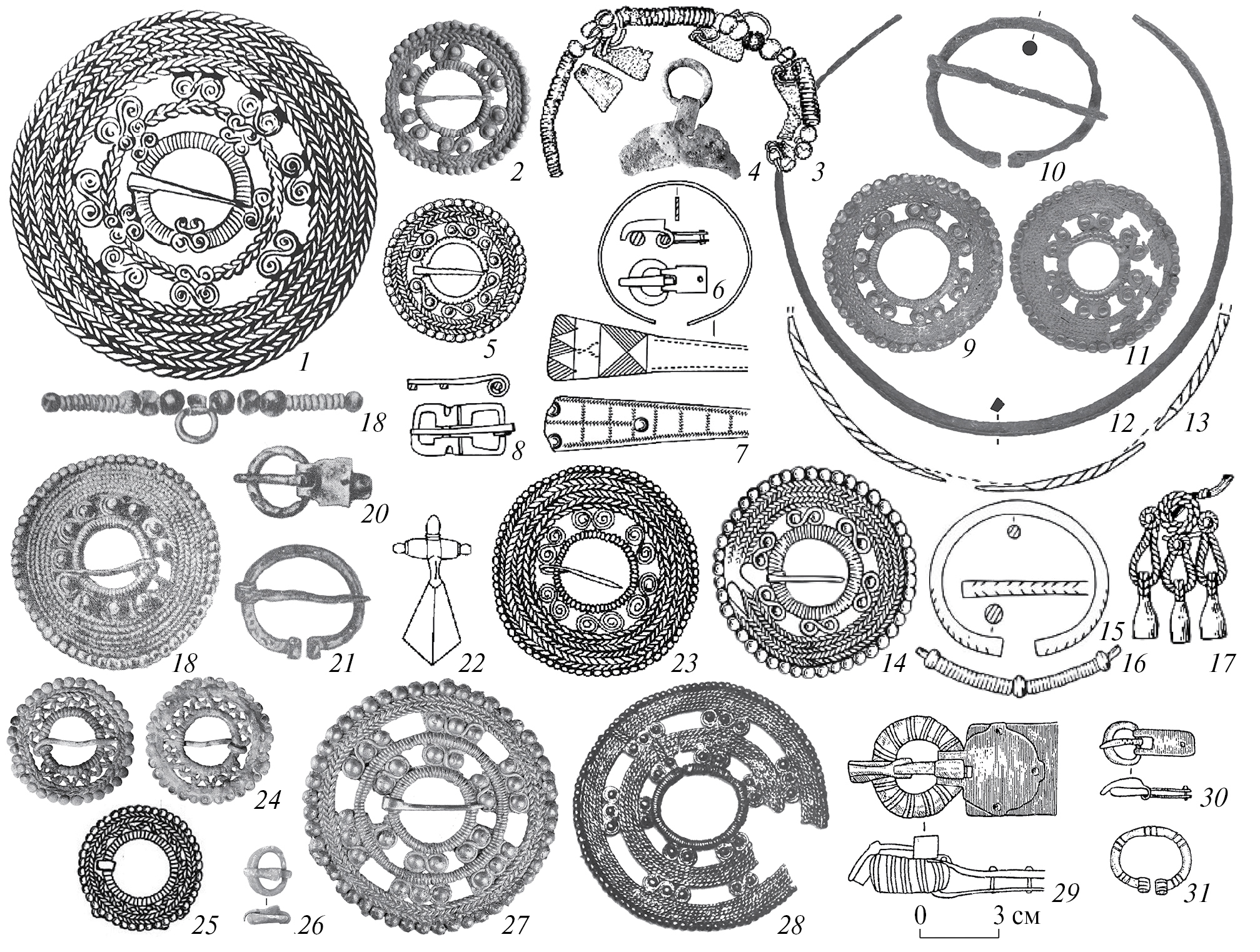 Рис. 5. Ажурные застежки из могильников за пределами основного ареала рязано-окской культуры. Холуй: 1 – погр. неизв.; Подвязье: 2–4 – п. 36Б; Абрамово: 5–8 – п. 130; 25 – п. 126; Безводное: 9, 10, 12 – п. 142; 11 – п. 159; 18–21 – п. 85; Шокша: 13–17 – п. 853; Желтухино: 22, 23 – п. 23; Бол. Давыдовское 2: 24 – п. 12; Абакумлевский клад: 26, 27; Мл. Ахмылово: 28–31 – п. 128. 1 – по: Горюнова, 1961; 2–4 – по: Грибов, 2016, 2018; 5–8, 25 – по: Ставицкий, Шитов, 2013; 9, 11, 12 – Государственный музей-заповедник “Куликово поле”, КП-63-ТД-61/1, НВ-8/104, КП-99-ТД-89/36 (фото А.С. Морозова); 10, 18–21 – по: Краснов, 1980; 13–17 – по: Шокшинский могильник, 2023; 22, 23 – по: Уткин, Черников, 1994; 24 – по: Зайцева, 2011; 28 – по: Никитин, Никитина, 2004; 29–31 – по: Никитина, 1999.