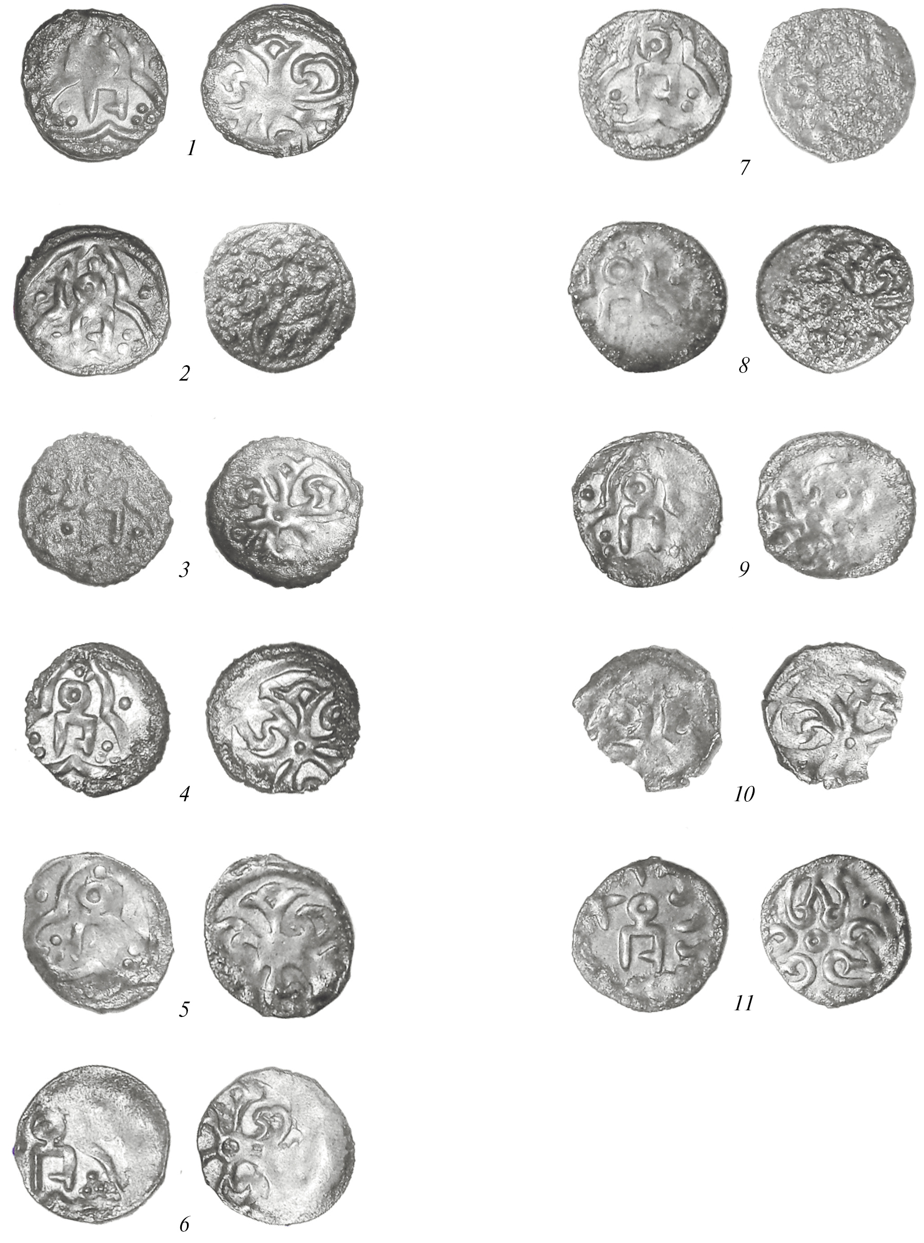 Рис. 1. Монеты клада из раскопа CXCII. 1–10 – дирхамы типа С/180. 11 – дирхам типа С/197.
