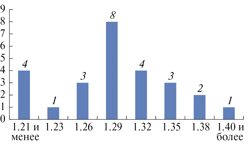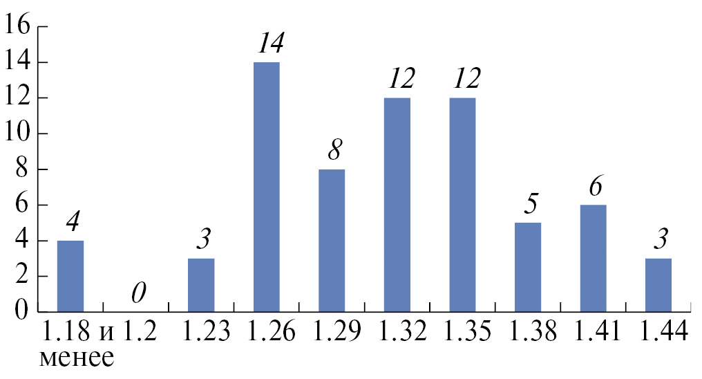 Метрология С/180. Учтено 67 экз. (каталог А.З. Сингатуллиной – 28 экз., Болгарское городище, раскоп 179 – 5 экз., раскоп 192 – 9 экз., фотоархив автора – 25 экз.). Мода – 1,26±0,02 г. (Допуск ±0,02 – здесь и далее по тексту указана не математическая ошибка данного расчета, а возможное отклонение реального значения моды монет изучаемого типа (длительность обращения которых на рынке была различна) от значения их первоначального веса, который они имели сразу после чеканки. В данном случае нами принято, что это удвоенная величина математической ошибки (консультация к.и.н. П.Н. Петрова) (14 экз., 20,9% от всех учтенных монет). Средний вес – 1.296 г.