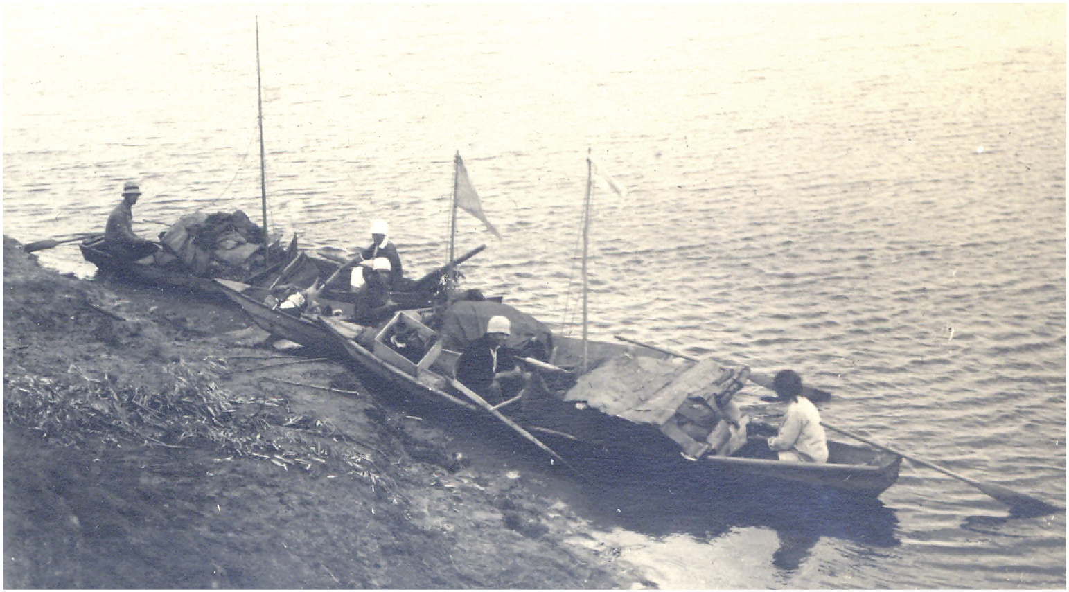Fig. 2. Excavations at the Chortovo fortified settlement: boats of the Vetluga expedition. O.N. Bader is at the left astern. 1925