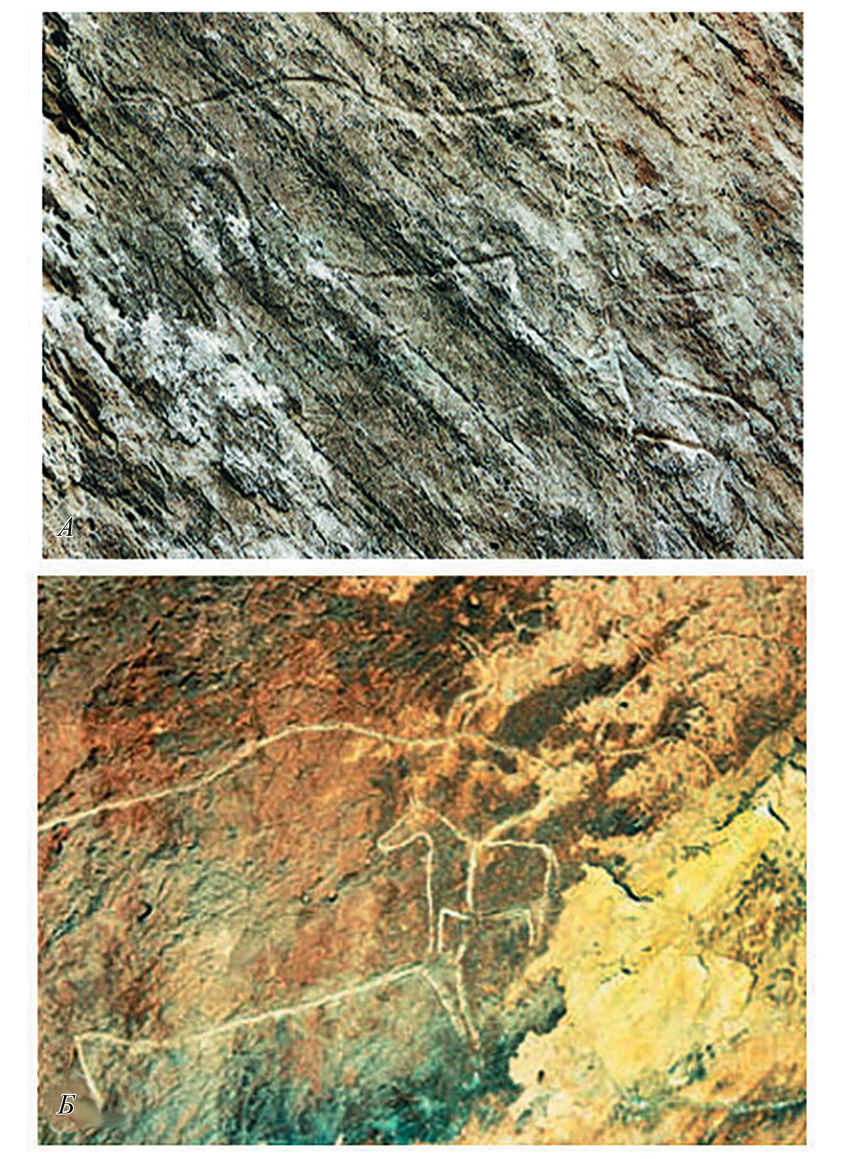 Рис. 2. Гобустан. Убежище Аназага, камень 31 (по: Джафарзаде, 1973): А – изображение первобытного быка в верхнепалеолитическом стиле (стиль 1 Гобустана) (длина изображения – 176 см), ниже и правее – гравировка лошади (онагра?) в неолитическом (?) стиле 3а (длина изображения – 61 см) (фото автора); Б – изображение первобытного быка (по: Sigari, 2013) с подновленным позже контуром; перекрывается гравировкой лошади неолитического (?) стиля. Патина на гравировке быка после “подновления” рисунка резко отличается от патины на скальной поверхности.