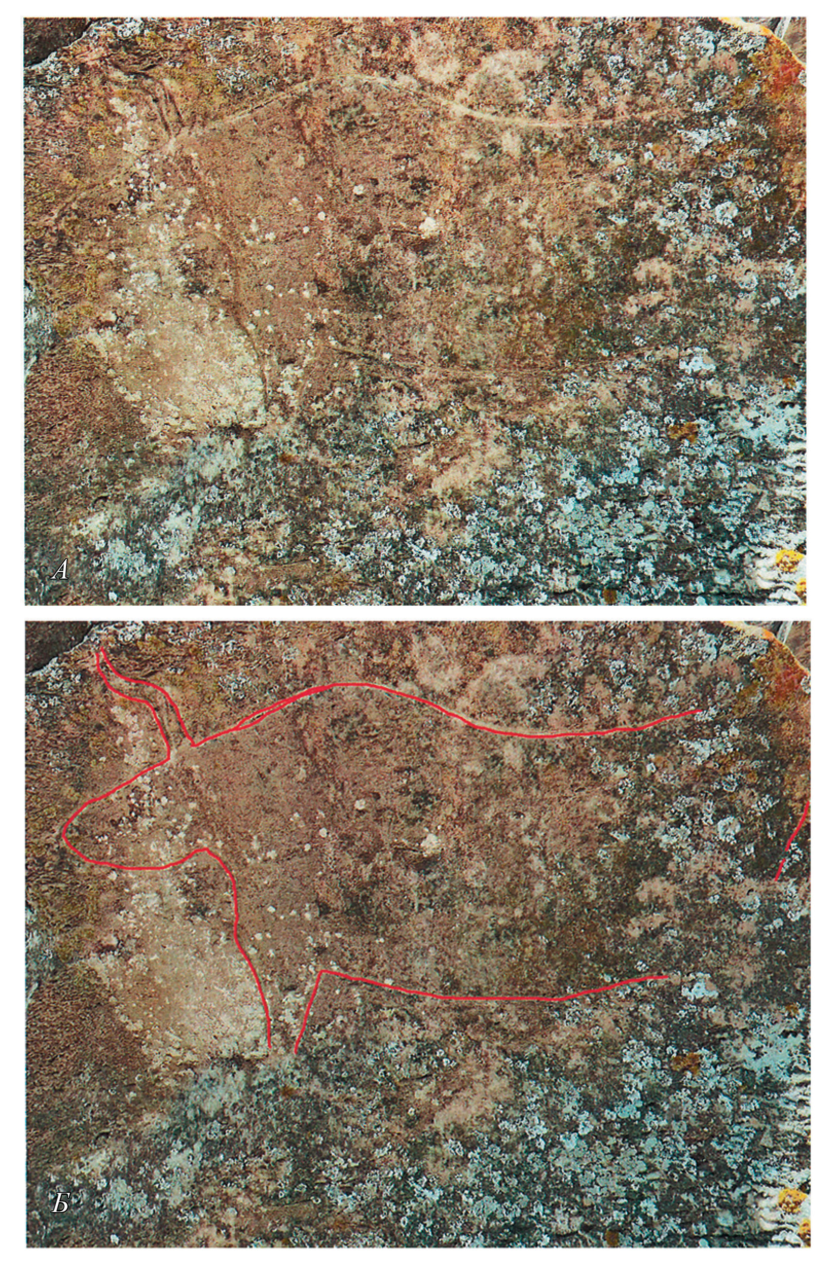 Рис. 4. Гобустан. Гора Кичикдаш. Убежище Гаяаарасы 2, камень 5 (по: Джафарзаде, 1973). Изображение верхнепалеолитического стиля Гобустана (стиль 1): А – естественный вид; Б – то же, обведенное красным. Длина изображения – ок. 120 см. Фото автора.