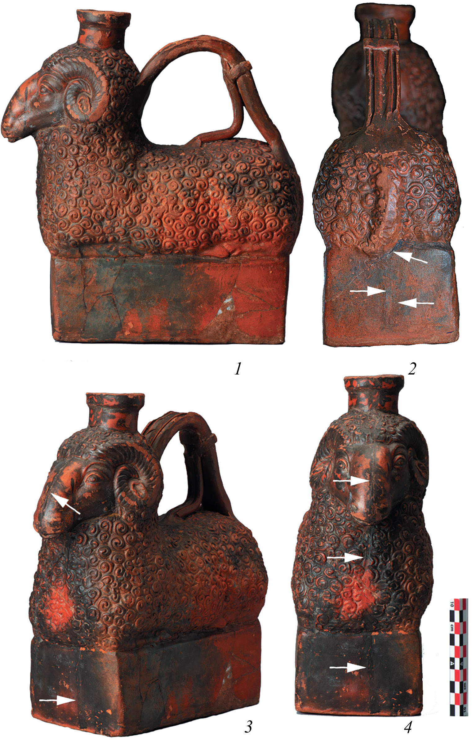 На фигурном сосуде в виде барана методом рентгеновской томографии выявляется большое количество хаотично расположенных трещин до 1.5 мм шириной, проникающих на всю толщину стенок объекта (рис. 3А, 1; 4, 2). Трещины частично заполнены реставрационным составом. В левой нижней части постамента наблюдается область утраты материала размерами до 32 × 32 мм (рис. 4А, 1). Она имеет неправильную форму и заполнена реставрационным составом. На некоторых участках поверхности сосуда дифференцируется слой толщиной 100-300 мкм, вероятно, являющийся лаковым покрытием (рис. 4Б, 3). Толщина этого слоя максимальна в углублениях рельефа поверхности. Сложность трактовки данных томографии по этому сосуду связана с наложением технологических швов и следов реставрационных работ. Однако можно выделить следующие элементы конструкции сосуда: ручка, горло, тулово и дно.