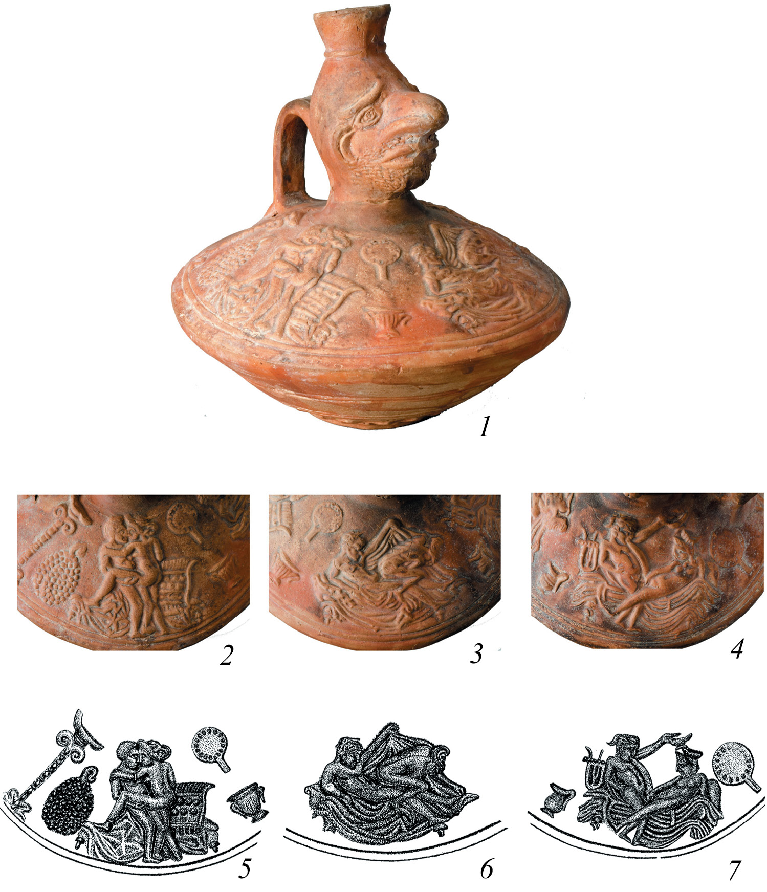 Рис. 2. Лагинос из могильника Бельбек IV. Середина – вторая половина II в. н.э. Фото И.А. Седенькова. 1 – общий вид; 2–7 – декор на тулове.