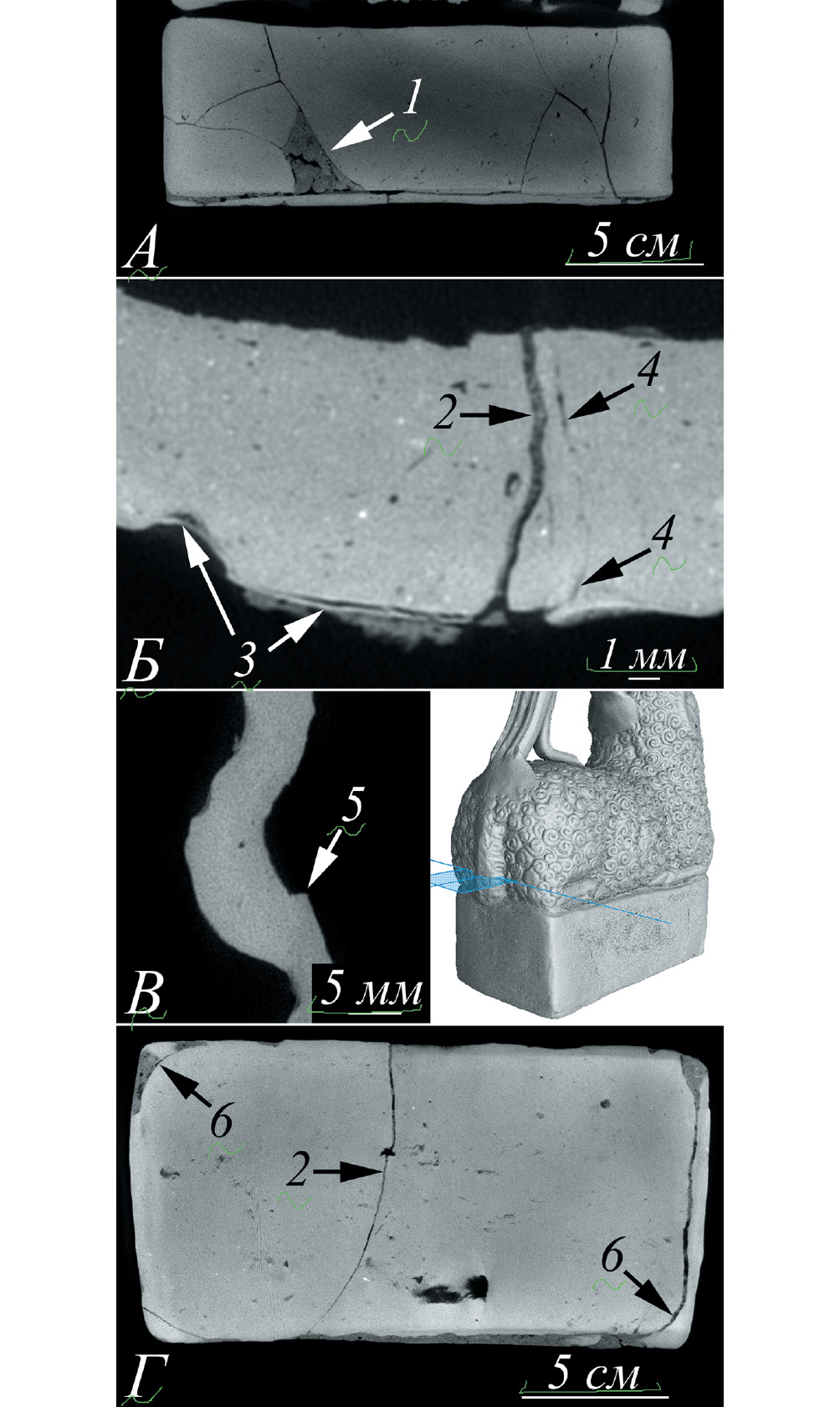 Рис. 4. Рентгенотомографические сечения фигурного сосуда в виде фигуры барана: А – область утраты керамики в левой нижней части постамента, заполненная реставрационным составом; Б – фрагмент вертикального шва между правой и левой сторонами головы сосуда; В – выступ материала в зоне соприкосновения правой и левой частей тулова; Г – сечение, проходящее через дно сосуда. 1 – зона утраты керамики, 2 – трещины, 3 – поверхностное покрытие, 4 – полости в зонах соединения конструкционных деталей, 5 – выступ материала, 6 – область прикрепления дна к нижней части постамента.