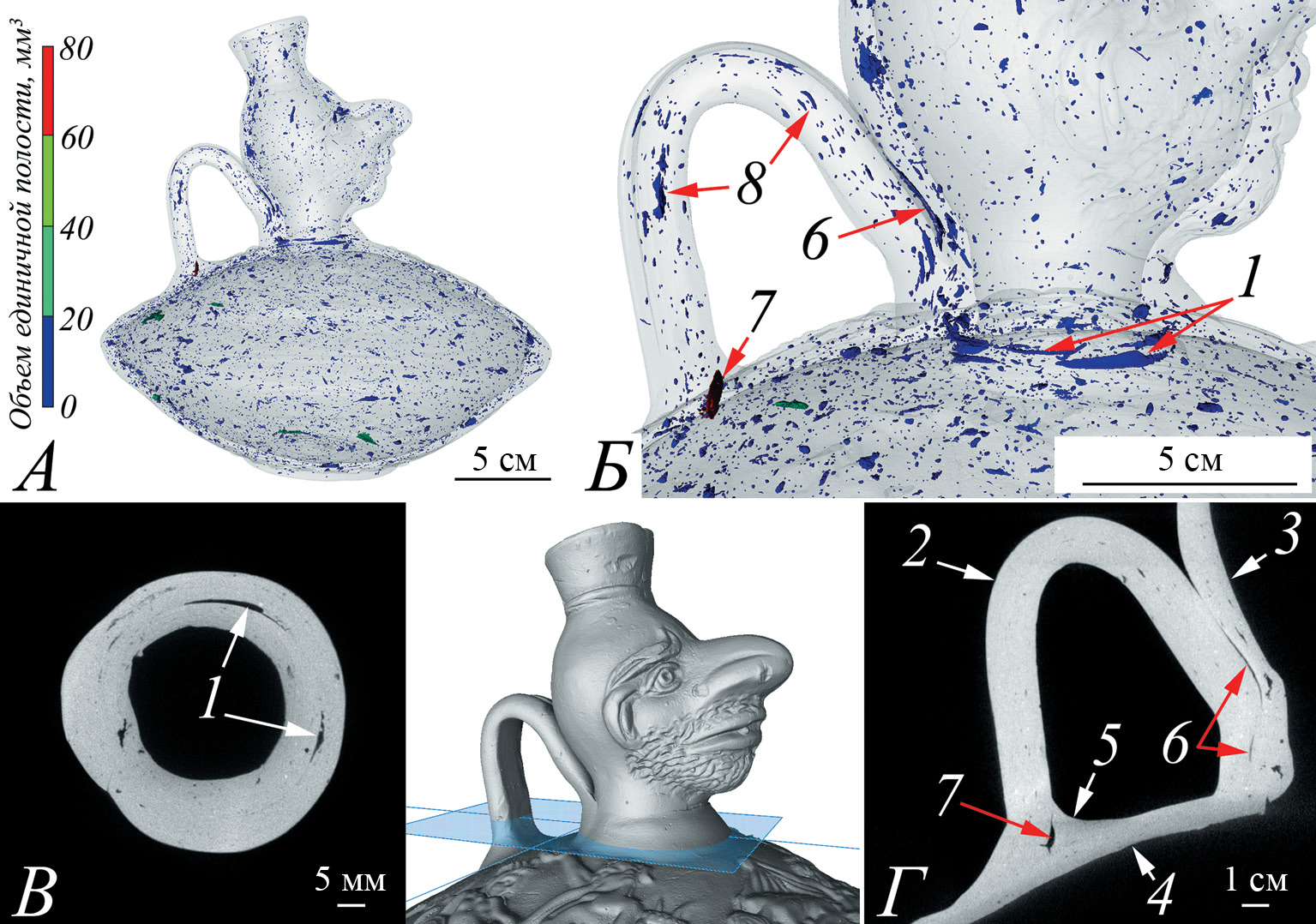 Рис. 6. Результаты рентгеновской томографии лагиноса: А – расположение полостей внутри стенок сосуда; Б – крупные полости в местах крепления ручки и головы; В – область крепления головы на тулове с положением секущей плоскости; Г – крепление ручки сосуда к тулову. 1 – полости между верхней частью тулова и головой; 2 – ручка; 3 – задняя стенка головы; 4 – верхняя часть тулова; 5 – дополнительный клиновидный фрагмент керамической массы для фиксации ручки; 6 – полости между ручкой и головой; 7 – полость между клиновидным фрагментом керамики и ручкой; 8 – продольные полости внутри ручки.