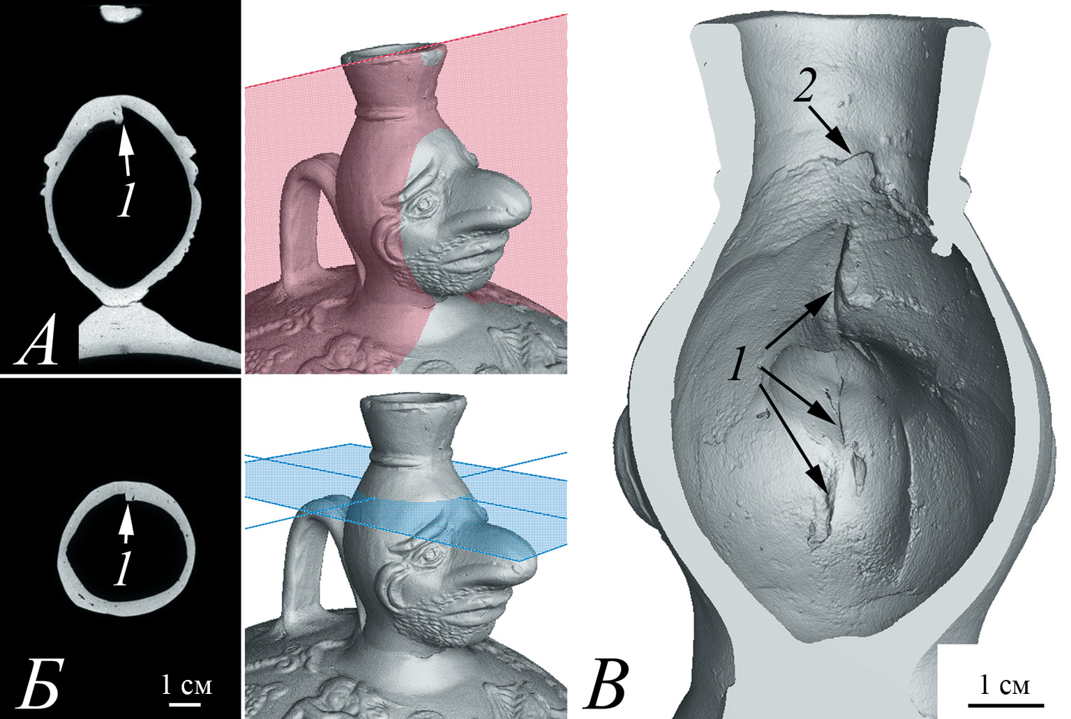 По томографическим данным, лагинос с рельефными изображениями на тулове имеет хорошую сохранность, следов восстановления не наблюдается. Материал сосуда в целом имеет однородную морфологию. Сосуд состоит из нескольких конструкционных элементов: тулова, ручки, головы и раструбообразного горла. Толщина стенок тулова – от 2 до 5 мм, головы – от 1.8 до 8.5 мм, горла – от 4.4 до 6.2 мм. В зонах крепления конструкционных элементов сосуда наблюдаются характерные вытянутые полости между неплотно прижатыми частями керамики (рис. 6А, Б). Голова оттиснута в двухстворчатой форме. Зона соединения двух частей головы (правой и левой) хорошо видна на внешней поверхности лицевой стороны в виде широкого шва. Кроме того, в зоне соединения просматривается выступ около 2.5 мм, который образовался на внутренней поверхности лицевой стороны головы в результате неполного совмещения двух частей (рис. 7, 1). Тонкая детализация черт лица (бороды, губ и глаз) позволяет предположить, что эта зона доработана стеком.