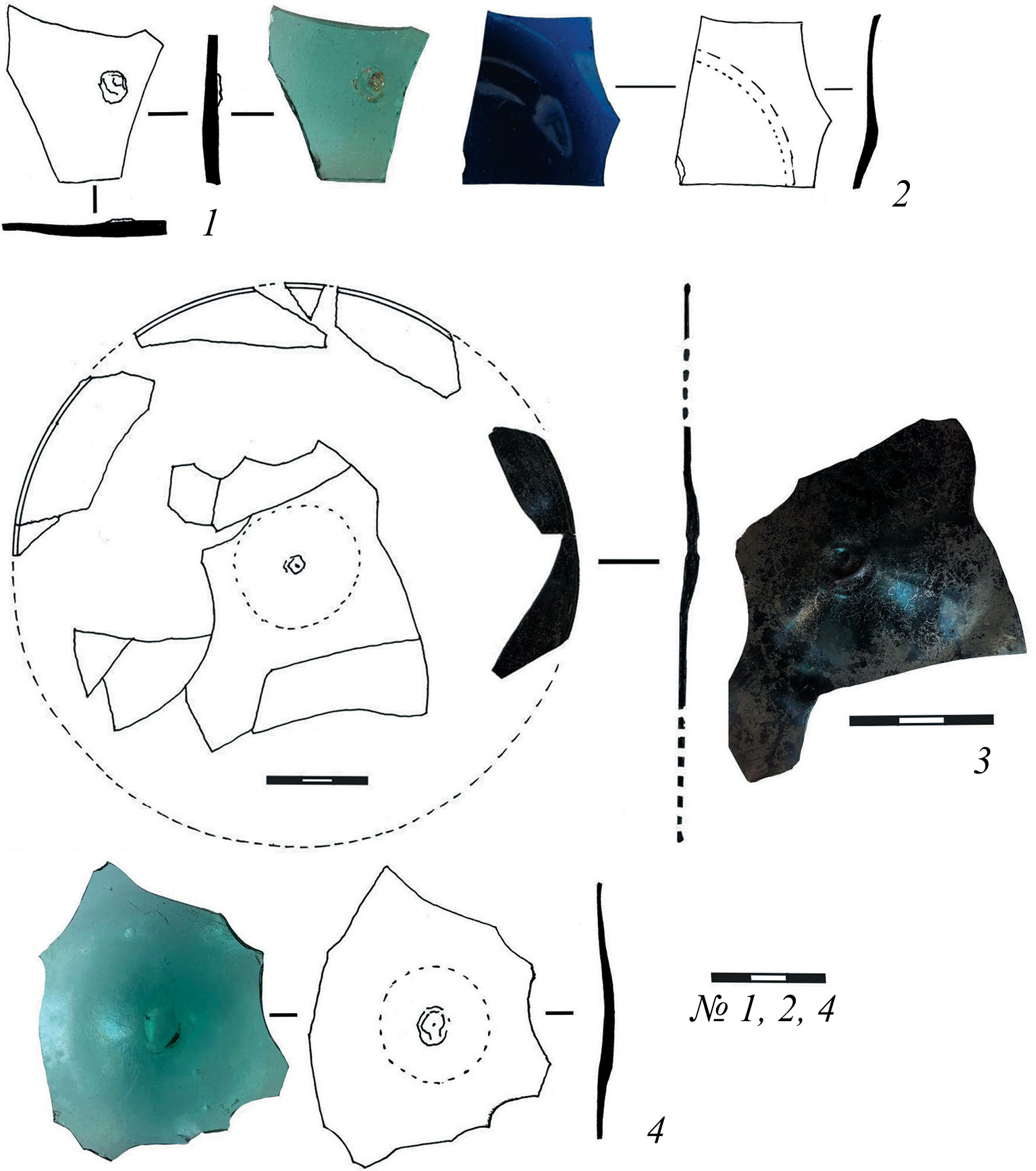 Fig. 2. Central parts of window discs (1, 2, 4) and fragmented purple disc (3), 2, 3 – coloured glass