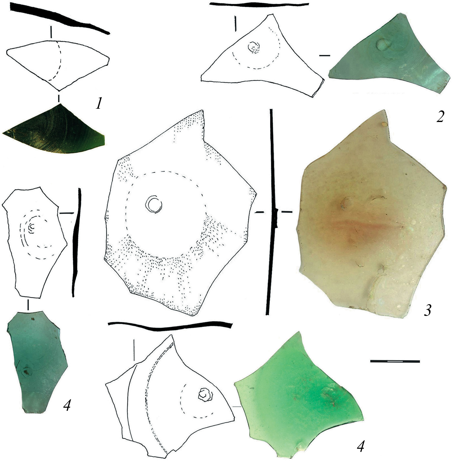 На нашем объекте находки оконных стекол представляют собой плоские осколки, края дисков с разным оформлением ребра жесткости и их центральные части с вариантами профилировки. Диски имеют утолщение в центре от 2.5 до 4-5, реже 8-10 мм. Толщина их краев составляет 1.0-1.5 мм. На одной стороне в центре часто виден отпечаток налепа 6-10-мм в сечении понтии (рис. 2, 1, 3, 4). Одна сторона дисков обычно гладкая блестящая (рис. 2, 2; 3, 2, 4), другая – чуть шероховатая, с тончайшими концентрическими бороздками-царапинами от вращения на плоскости при выравнивании (рис. 4, 1). В стекле многих фрагментов видны круглые или растянутые по окружности мелкие пузырьки воздуха (рис. 2, 4; 3, 2, 7; 5, 7; 6, 7, 15).