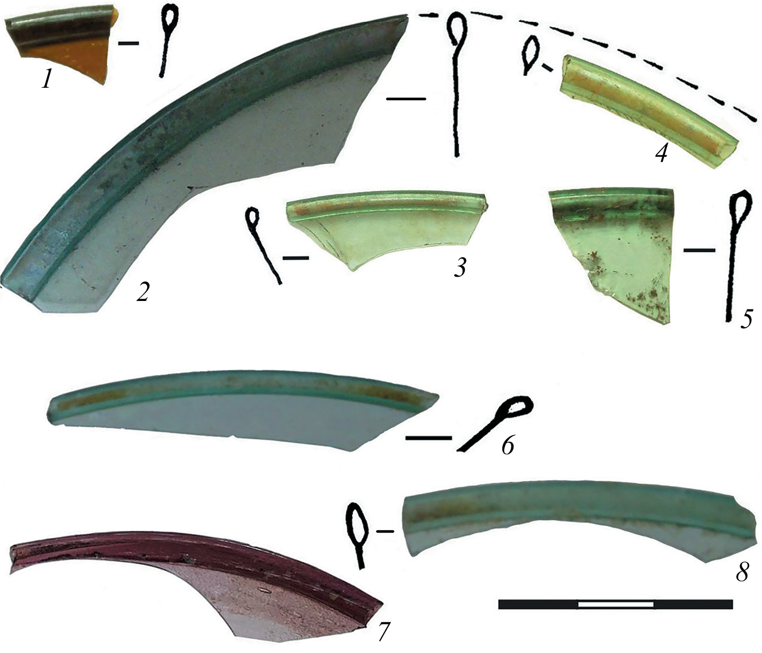 Первый тип характеризуется загнутым, аккуратно прижатым к диску по всей окружности краем, из-за чего образовалась полая петлевидная в сечении закраина шириной от 2.5 до 6.0 мм, служившая ребром жесткости (рис. 5). Такие диски преимущественно бесцветные, но встречаются и немногочисленные бледно-пурпурные, коричневые, светло-зеленые и бледно-голубые фрагменты. В целом круг их аналогий широк и в числе прочих включает оконное стекло XI в. с Нижнего Архыза (Щапова, 1993. С. 276. Рис. 2, 4–7) и XII–XIV вв. из Грузии (Чхатарашвили, 2007. С. 78. Табл. XLIV, 6, 7).