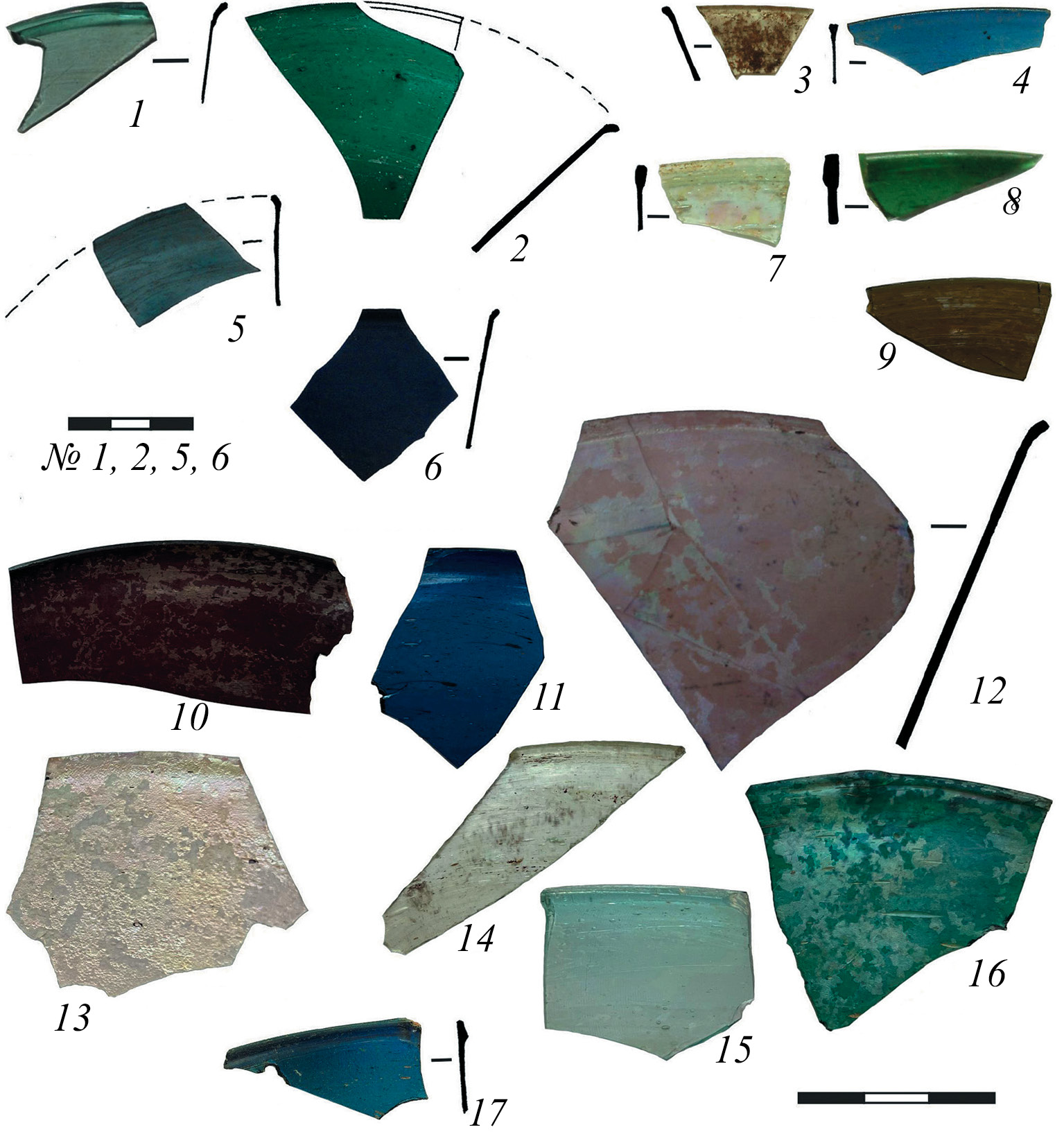 Fig. 6. Edges of window discs of the second type. 2, 4, 6, 8–12, 16, 17 – Coloured glass