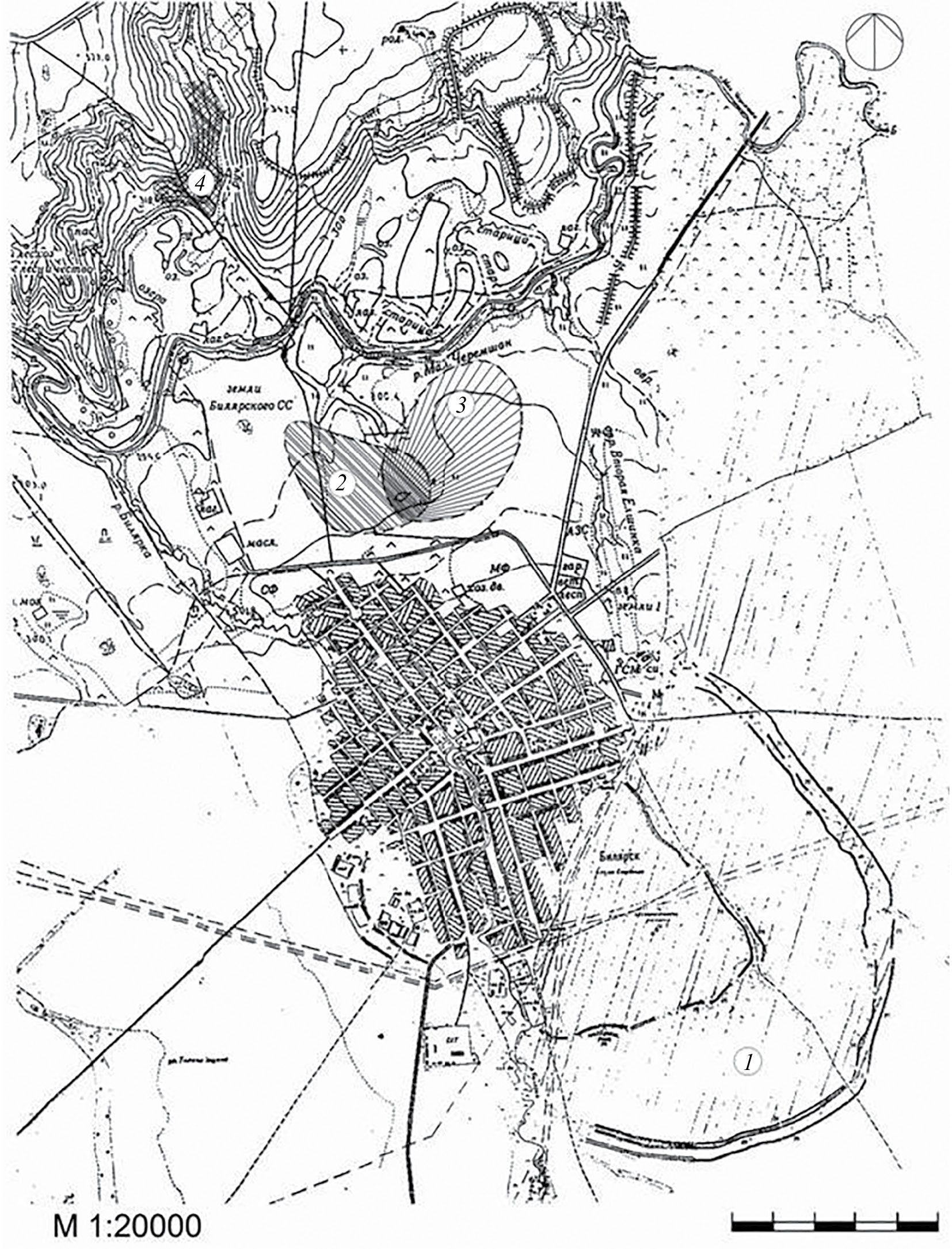 Fig. 1. The location of sites in the northwestern district of the Bilyar fortified settlement: 1 – the Bilyar fortified settlement, the 11th – first third of the 13th century AD; 2 – Bilyar of the Golden Horde (Bilyar III settlement), the second half of the 13th – early 14th century AD; 3 – Bilyar II settlement, turn of the 10th/11th century – first half of the 11th century AD; 4 – Toretskoye urban settlement, the 15th century AD; 5 – the modern village of Bilyarsk