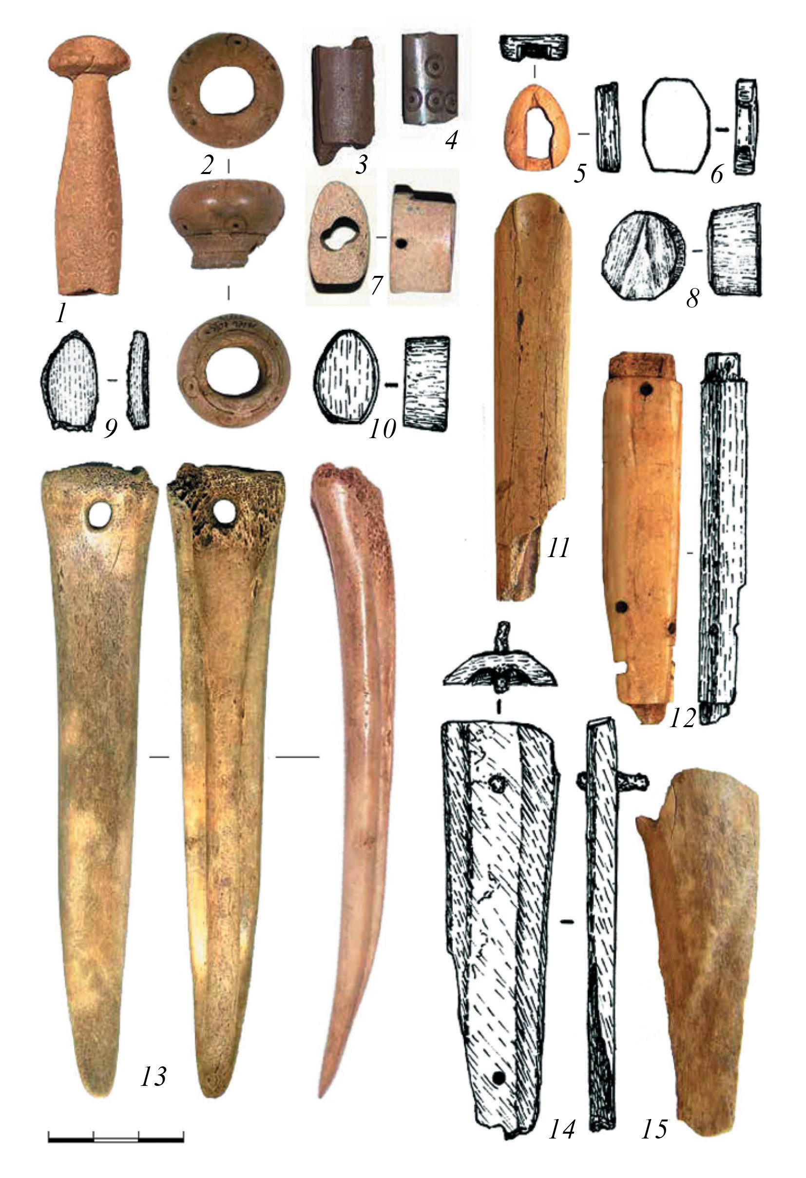 Рис. 2. Изделия из кости и рога Торецкого городского поселения: 1, 2 – рукояти; 3, 4 – осколки рукоятей разных инструментов; 5–12, 14 – рукояти ножей, детали и заготовки к ним; 13 – кочедык; 15 – фрагмент рога со следами обработки.