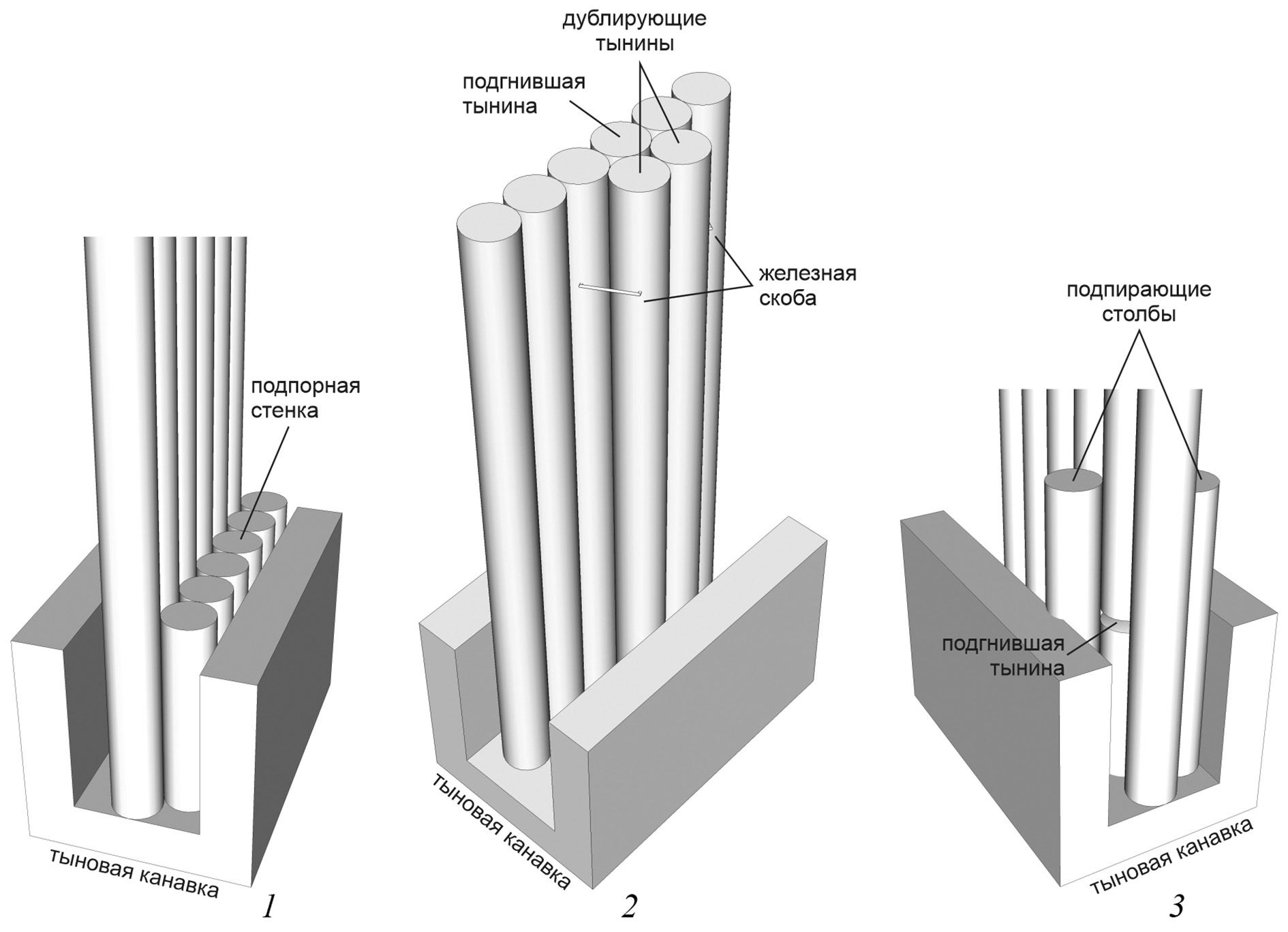 Рис. 4. Реконструкция участков стен с остатками двойных и тройных рядов вертикальных бревен. 1 – подпорная стенка при тыновой стене; 2 – бревна, дублирующие пришедшую в негодность тынину; 3 – столбы-крепления подгнившей тынины.