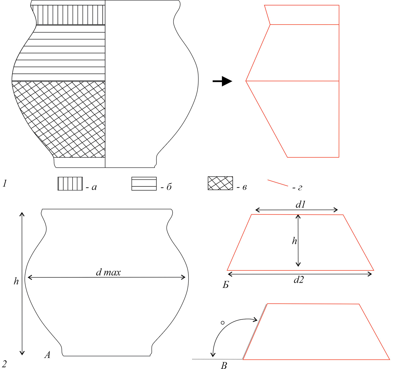 Fig. 1. Research methodology: 1 – the functional parts subject to analysis (а – cheek-neck, б – shoulder-brachium, в – body, г – frame of vessel shape); 2 – the parameters of vessel shapes under study: A – general proportion of vessel shape, Б – proportion of functional parts, В – inclination angle of functional parts frame