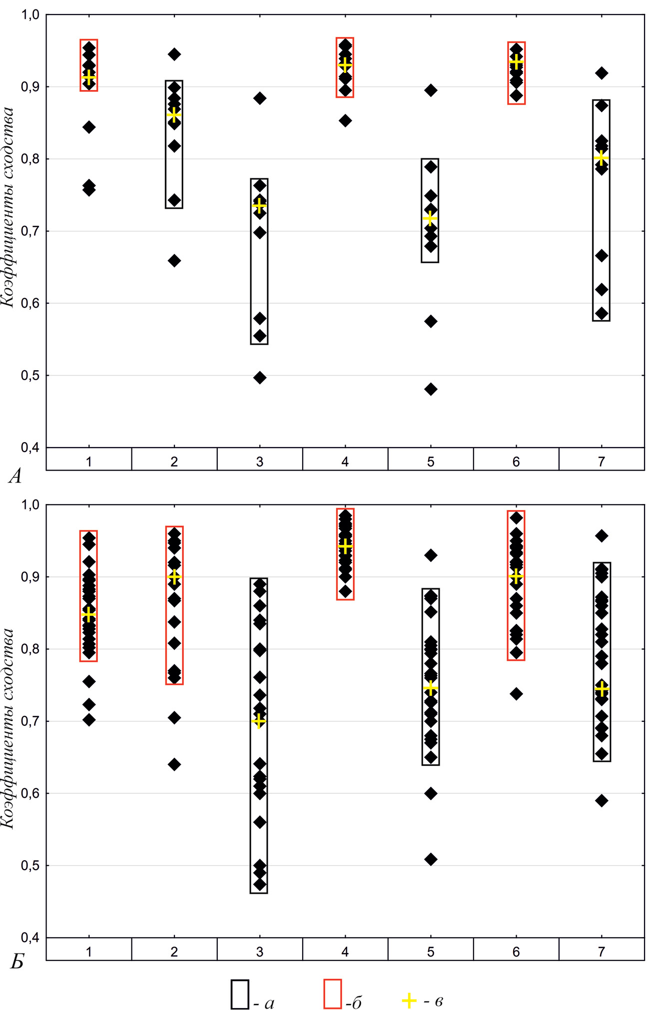 Рис. 2. Результаты изучения устойчивости параметров форм сосудов: А – группа 1, гончарный круг; Б – группа 2, скульптурная лепка. Условные обозначения: а – диапазон характерных значений, б – диапазон характерных значений у наиболее устойчивых параметров, в – медианное значение.