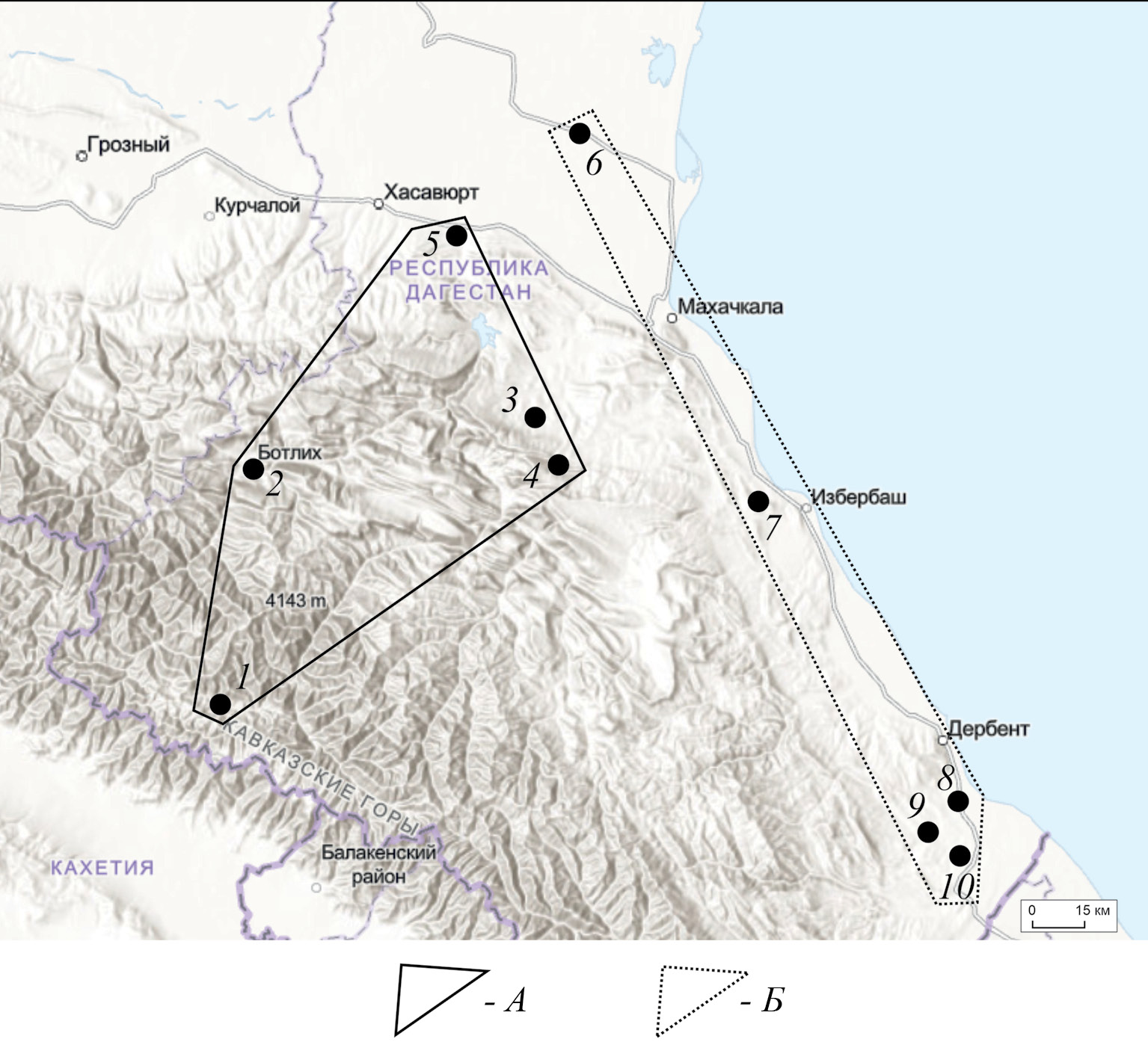 Fig. 3. The Albanian-Sarmatian and early medieval sites on the territory of Dagestan: 1 – Bezhta; 2 – Botlikh; 3 – Agachkala; 4 – Arkas; 5 – Verkhny Chiryurt; 6 – Lvovskie; 7 – Urtseki; 8 – Palasa-syrt; 9 – Sirtich; 10 – Sharakunsky. А – first group; Б – second group