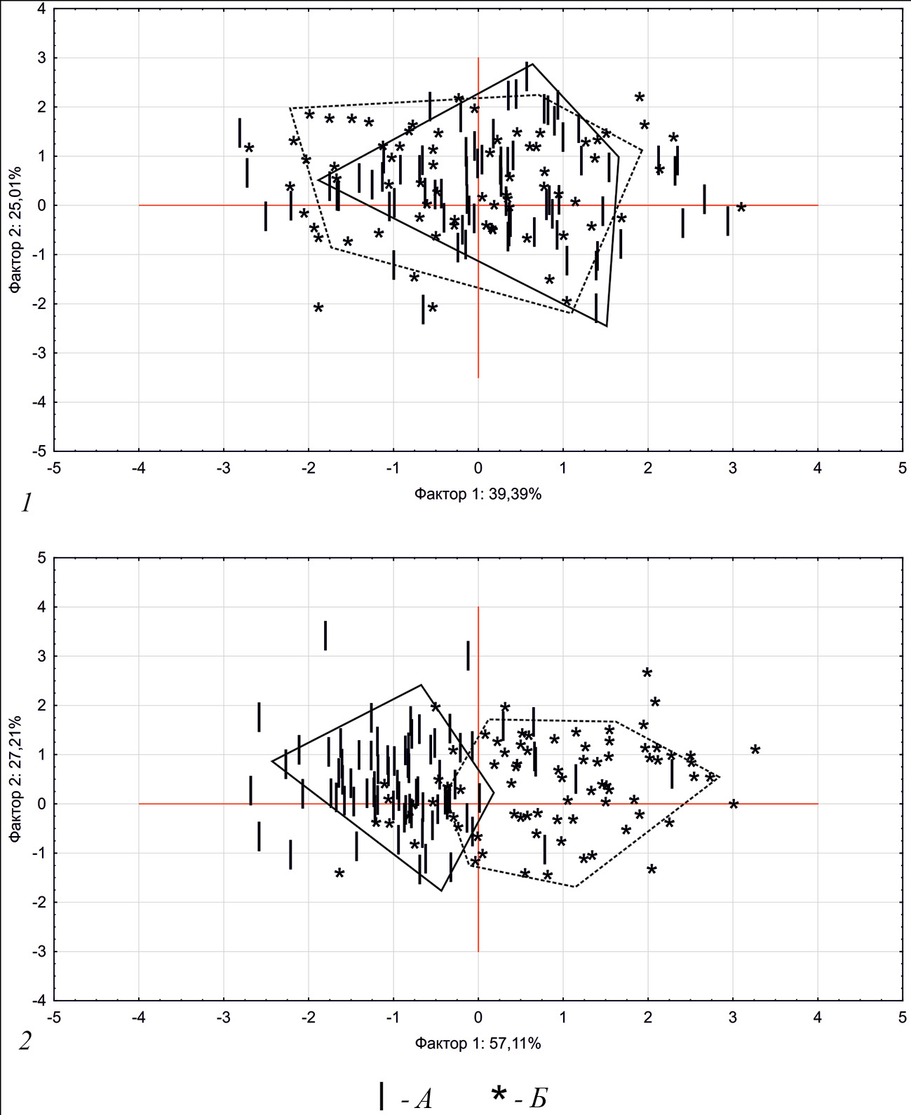 Рис. 5. Результаты сравнения форм кувшинов первой и второй групп методом главных компонент: 1 – анализ по неустойчивым параметрам; 2 – анализ по углу наклона тулова, углу наклона плеча-предплечья, общей пропорциональности сосуда. а – сосуды из памятников первой группы; б – сосуды из памятников второй группы.