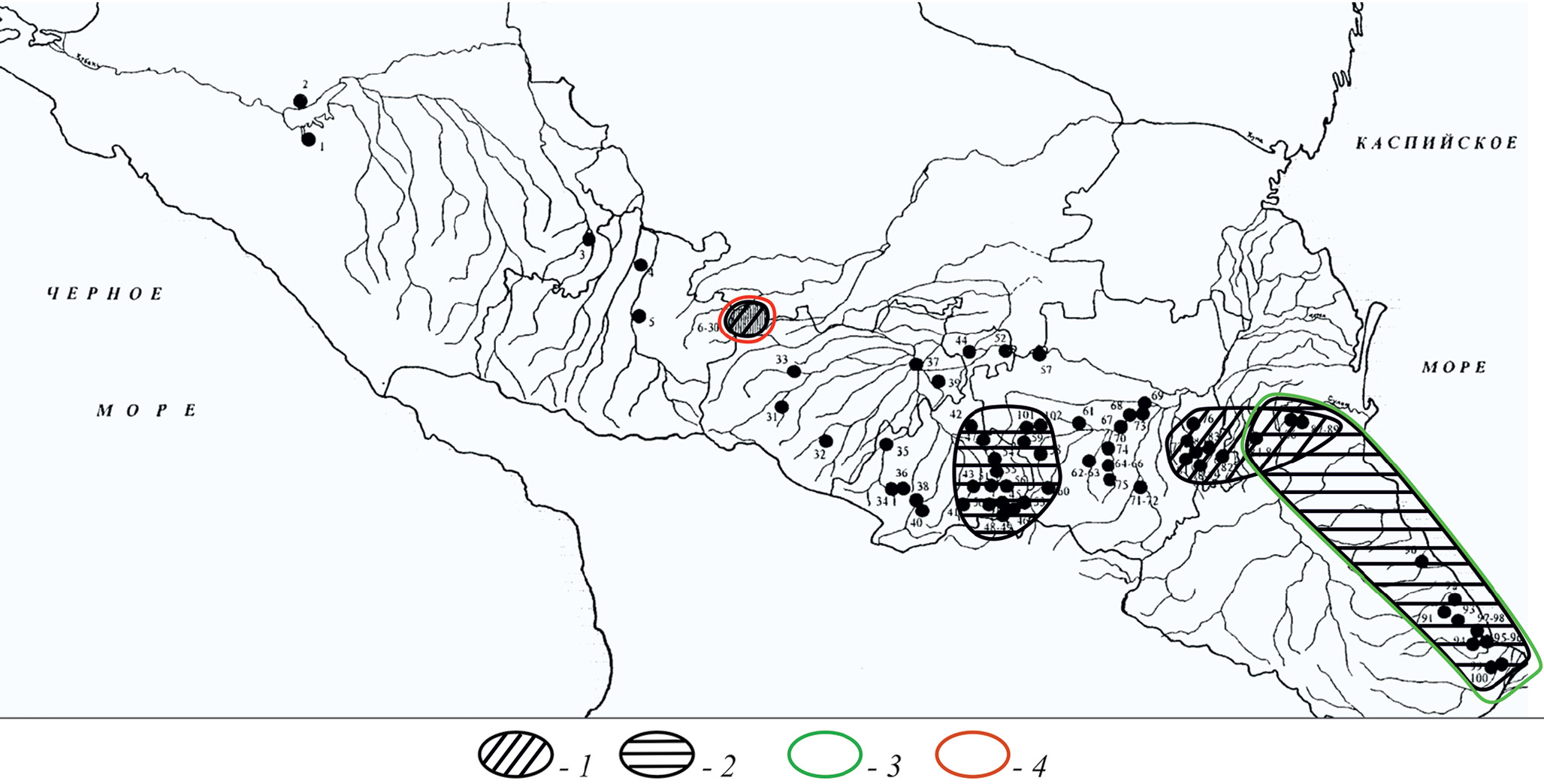 Рис. 8. Катакомбные могильники I тыс. н.э. на территории Северного Кавказа (по Коробов, 1999. Рис. 1) (1 – районы, в которых преобладает расположение покойных головой влево от входа в камеру; 2 – районы, в которых преобладают катакомбы с низкими погребальными камерами; 3 – вероятный район происхождения доминантных традиций создания форм кувшинов Дмитриевского могильника; 4 – вероятный район происхождения рецессивных традиций создания форм кувшинов Дмитриевского могильника.