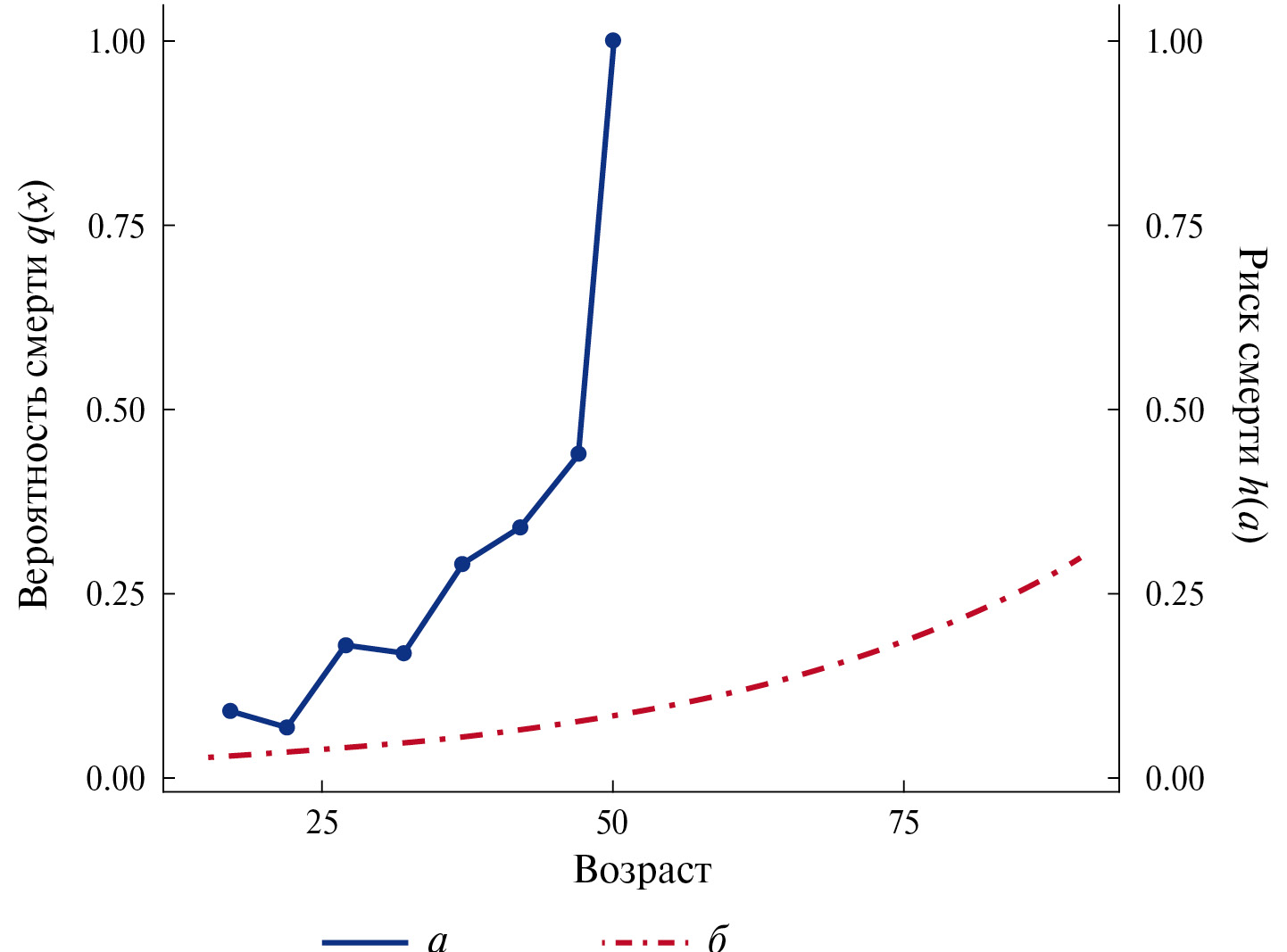 Рис. 5. Сравнение демографических показателей, рассчитанных по таблице смертности и параметрической модели смертности Гомпертца (соответственно – вероятность смерти и риск смерти): а – данные по таблице смертности, б – данные по модели Гомпертца.