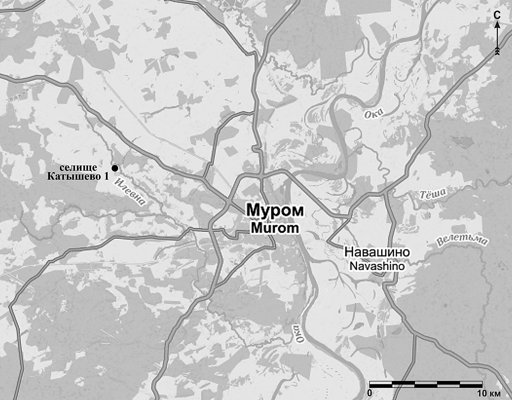 Селище Катышево 1 расположено в Муромском районе Владимирской области, на правом берегу р. Илевна (рис. 1). Это одно из крупных средневековых селищ региона, на котором до 2021 г. археологические раскопки не проводились. Впервые памятник выявлен в 1923 г. Ф.Я. Селезневым. Тогда на месте, называемом “оселок”, близ д. Катышево обнаружено 24 археологических предмета. Разведки были продолжены в следующем году, о чем свидетельствует заметка в газете (Селезнев, 1924). Среди находок, полученных при проведении разведок, значатся оселки, керамика, “шиферное” пряслице, предмет, похожий на шпору, подвеска и серп. В 1991 г. в рамках уточнения данных об известных памятниках археологии в Муромском районе велись работы силами Волго-Окской экспедиции под руководством А.Е. Леонтьева: систематизированы сведения о памятнике, сделан его топографический план, заложен шурф. Исходя из полученных материалов, селище датировано домонгольским временем (XII–XIII вв.). Границы объекта определены, преимущественно, по зоне распространения подъемного материала.