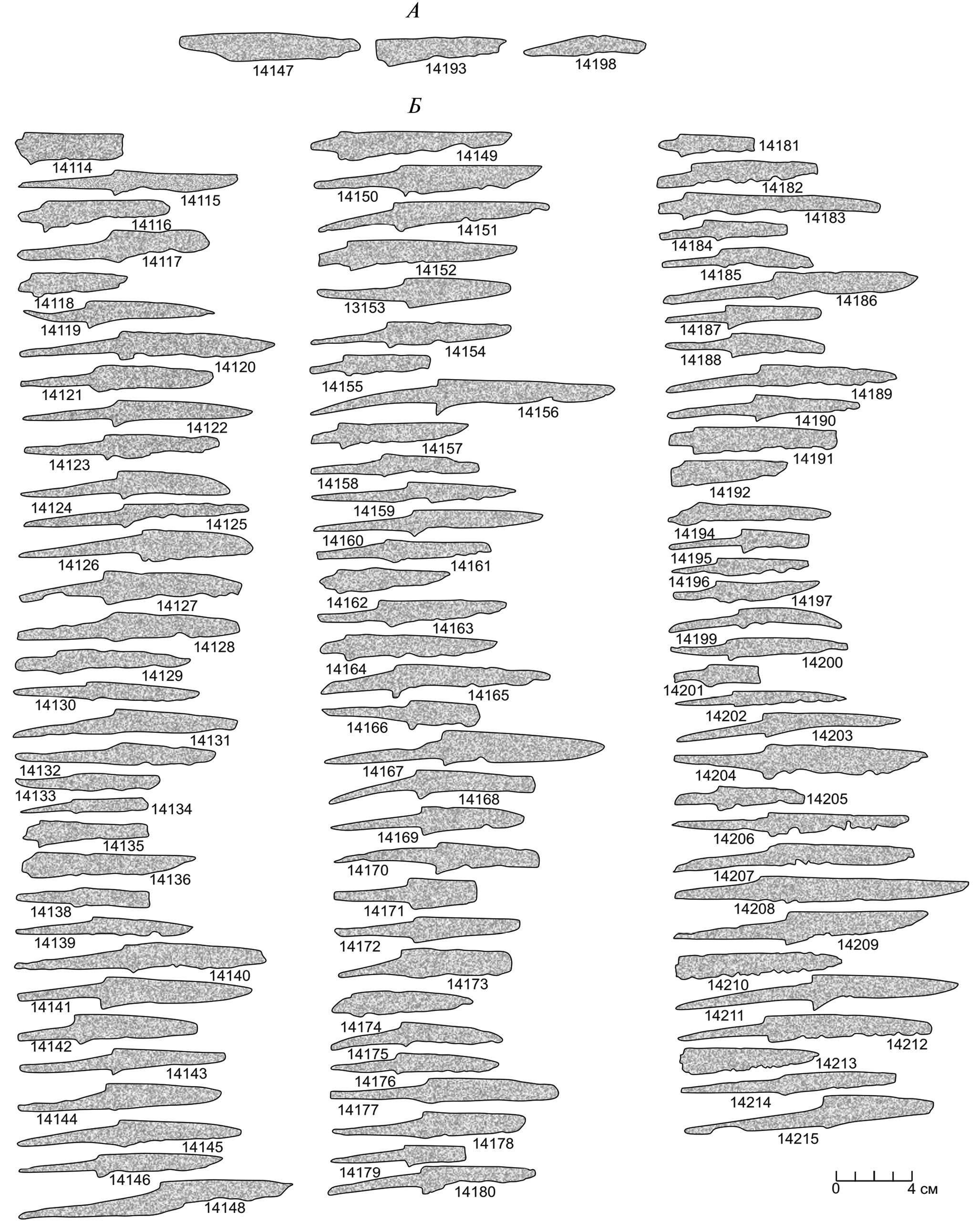 Помимо технологических данных при работе с выборкой селища Катышево получена информация о форме ножей (рис. 2). Только три экземпляра (менее 3%) не имеют уступа со стороны спинки при переходе от клинка к черенку (ан. 14147, 14193, 14198). На этом основании авторы, вслед за отечественными специалистами (Завьялов и др., 2012. С. 17), рассматривают их как ножи “финской” группы. Остальные ножи относятся к группе “древнерусских” (Завьялов и др., 2012. С.17): отличаются от описанных выше уступами при переходе от клинка к относительно короткому черенку. Клинок ножей этой группы широкий, в ряде случаев сильно сточен. Такая форма орудий характерна для материальной культуры населения Северо-Восточной Руси в период развитого и позднего средневековья.