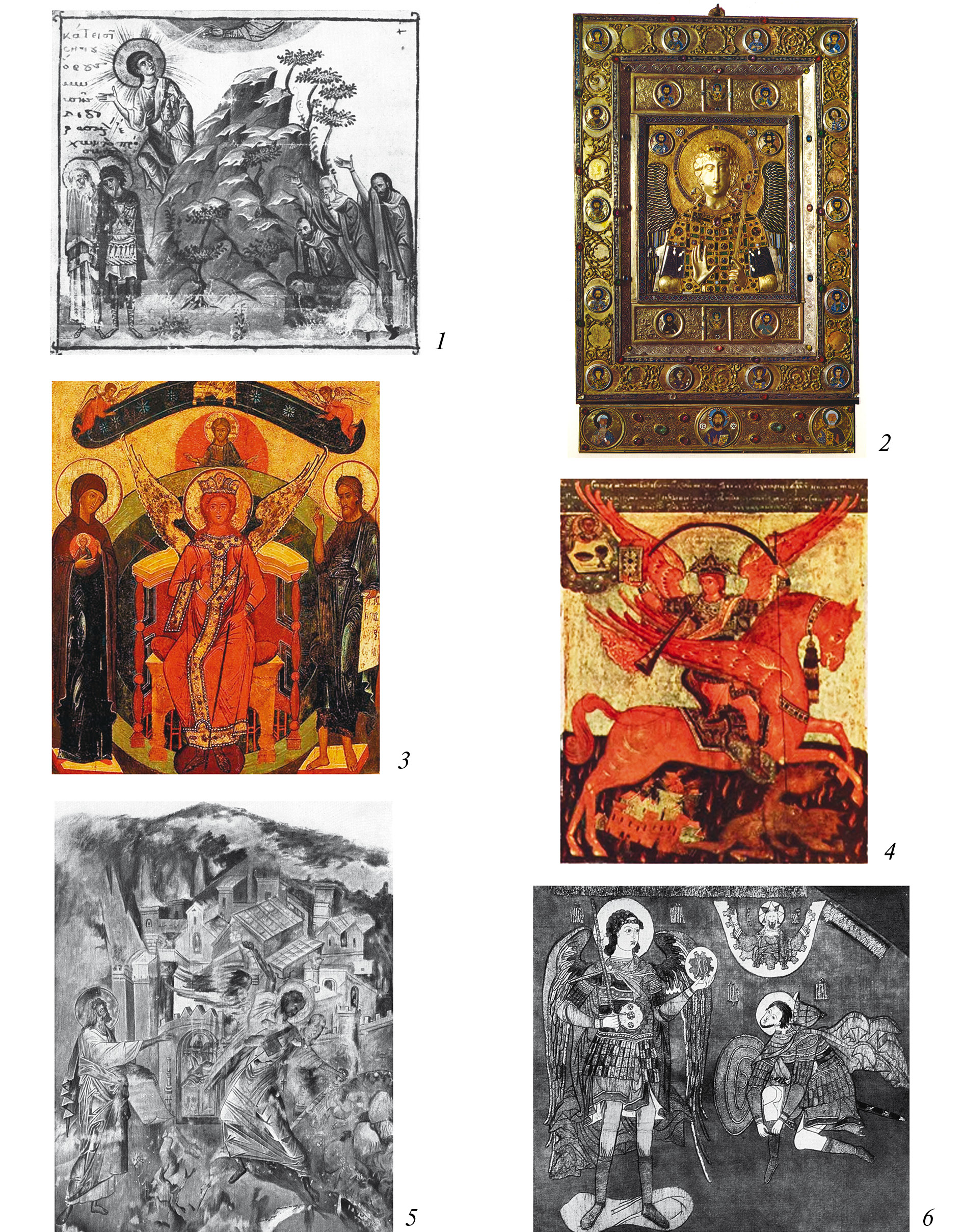 Рис. 2. Иконография ангелов и персонажей с сияющими или огненными ликами. 1 – Моисей с сияющим ликом, византийская миниатюра XII в. (по: Лазарев, 1948); 2 – архангел Михаил, пластина реликвария XI в. (золото, инкрустация, перегородчатая эмаль; использование золота для изображения лика), собор св. Марка, Венеция (по: L’art de Byzance…, 1979); 3 – св. София (лучезарный лик изображен красным), новгородская икона XV в. (по: Яковлева, 1977); 4 – архангел Михаил (огнезрачный лик и крылатый конь изображены красными), икона XVI в. (по: Антонова, 1966); 5 – ангел поражает ассирийское войско, фреска Кахриэ Джами, начало XIV в. (по: Лазарев, 1948); 6 – знамя, шитье, начало XVII в. (по: Свирин, 1962)