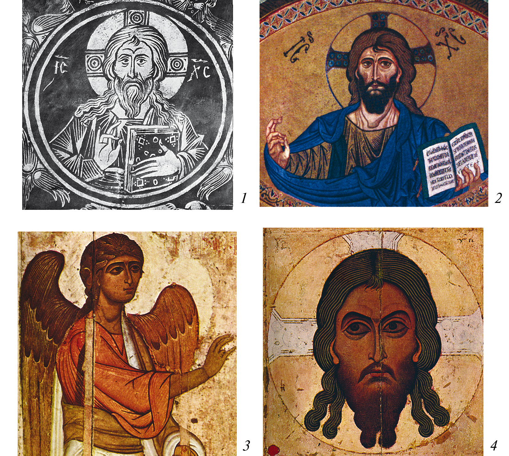 Рис. 3. Использование золота в восточно-христианском искусстве. 1 – пластина западных дверей Суздальского собора, огненное золочение (по: Овчинников, 1978); 2 – византийская мозаика собора в Чефалу (золоченая смальта использована для трактовки фона, власов Спасителя и разделки его риз), Сицилия, 1148 г. (по: Лазарев, 1948); 3 – Устюжское Благовещение (для изображения ангельских власов, оперения крыльев и разделки одеяний использован ассист), фрагмент, икона XII в. (по: Антонова, Мнева, 1963. Т. I); 4 – Спас Нерукотворный (для изображения власов использован ассист), икона XII в. (по: Onasch, 1961)