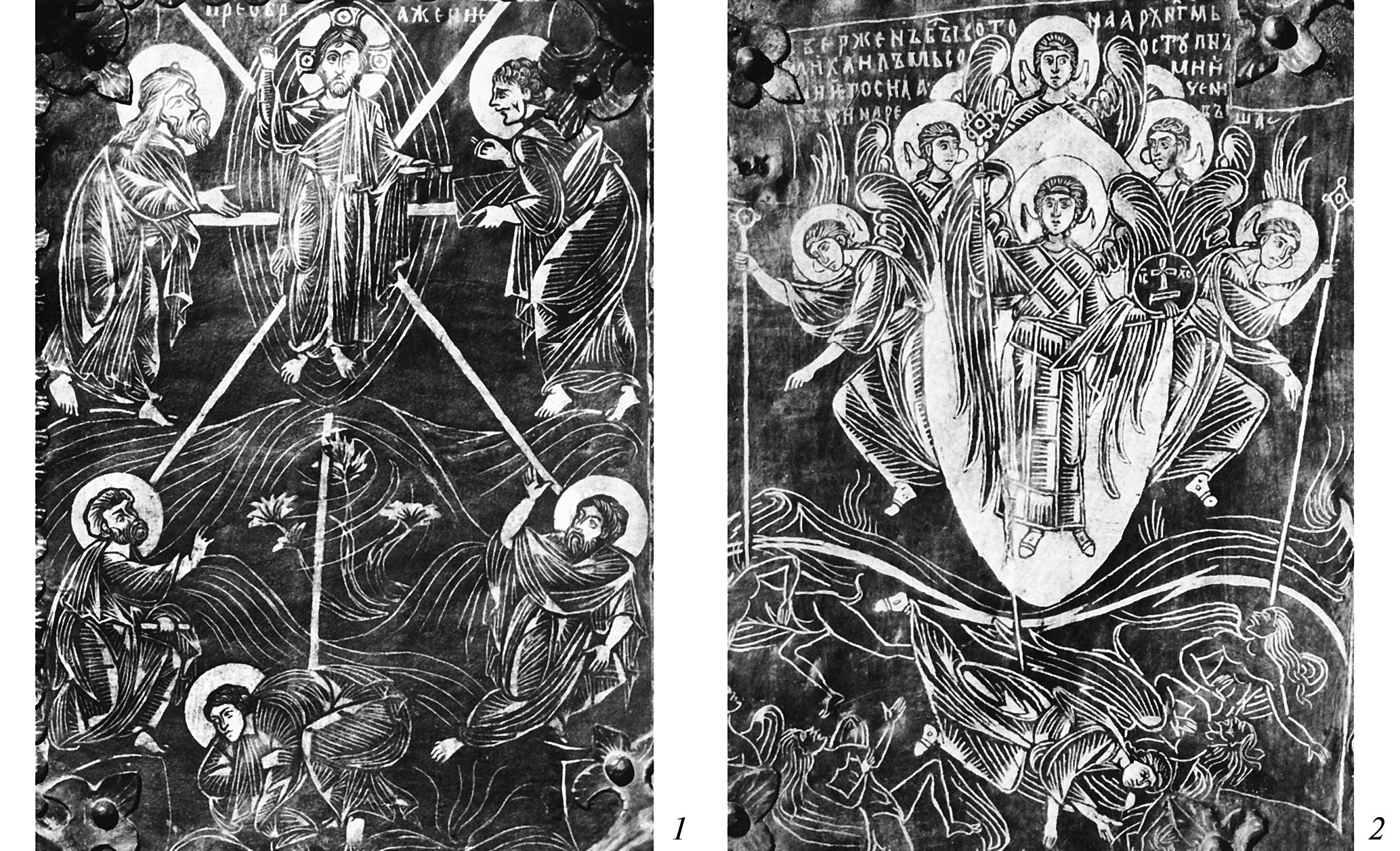 Тонкие полоски золотой смальты применялись для изображения складок облачений, украшающего их шитья наиболее почитаемых персонажей, прядей волос, оперения крыльев ангелов. Мозаики с таким использованием смальты известны в Киевской Руси (Каргер, 1964. Репр. 1, 2, 5, 22). Золотые фоны и использование золота для линейных штрихов было распространено и в книжной миниатюре, в частности, древнерусской начиная с Остромирова Евангелия (1056 г.). Подобные фоны преобладают также на византийских и древнерусских перегородчатых эмалях. Лики и ризы персонажей передавались цветными эмалями, ячейки для которых разделены тонкими золотыми перегородками. Последние образовывали золотые линии, своеобразную штриховую разделку изображений. Золочение в виде заливок и штриховок широко использовалось византийскими и древнерусскими иконописцами и имело специальное название “ассист” (Onasch, 1961. S. 349, 374, 426). Использование ассиста при изображении Христа, Богородицы и ангелов передавало божественное сияние и было признаком наиболее почитаемых персонажей (рис. 3, 3, 4). Технику огненного золочения можно рассматривать как обедненную монохромную живопись, в которой единственное изобразительное средство – рисунок золотом на черном фоне, сходный с использованием ассиста.