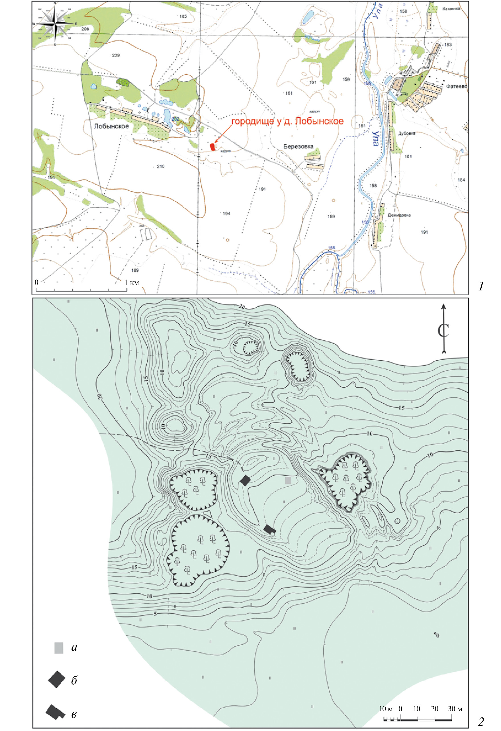 Городище у д. Лобынское расположено на левом берегу Лобынского оврага – левого притока р. Упа (правый приток р. Ока), в 1.7 км от устья, на мысу, образованном оврагом и многочисленными карстовыми провалами (рис. 1, 45; 2, 1). Площадка городища имеет подпрямоугольную в плане форму, размерами 60 × 40 м, высота над тальвегом оврага – 12–16 м. С напольной стороны городище защищено тремя рядами валов и рвов, так же два небольших вала расположены в мысовой части памятника. Высота валов – от 1 до 2.5 м, глубина рвов – от 1 до 2 м (рис. 2, 2). Судя по материалам раскопок, городище было возведено и наиболее активно использовалось в VIII – V вв. до н.э. Кроме того, на памятнике зафиксированы материалы типа Упа 2 (I в. до н.э. – I в. н.э.), а также горизонты X, XII – XIII и XIV – XV вв. (Простяков и др., 2023).
