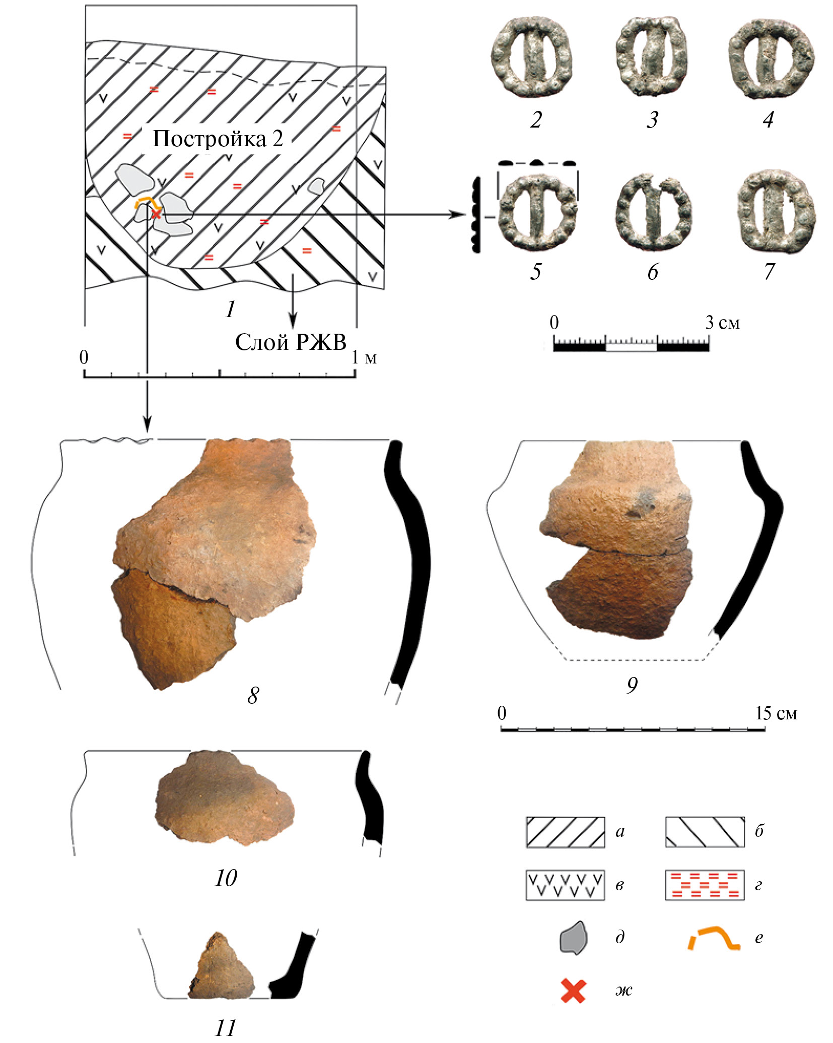 Рис. 7. Комплекс постройки 2. 1 – профиль заглубленной части постройки 2 (профиль В на рис. 4); 2–7 – серия нашивок из заполнения постройки 2 (№ 5 – in situ); 8 – развал лепного сосуда (in situ над № 5); 9–11 – фрагменты лепных сосудов из заполнения постройки 2. 2–7 – свинцово-оловянистый сплав. Условные обозначения: а – серая супесь; б – светло-бурая супесь; в – древесный уголь; г – обожженный грунт; д – камень; е – развал лепного сосуда (№ 8 на рис. 7); ж – находка нашивки (№ 5 на рис. 7)
