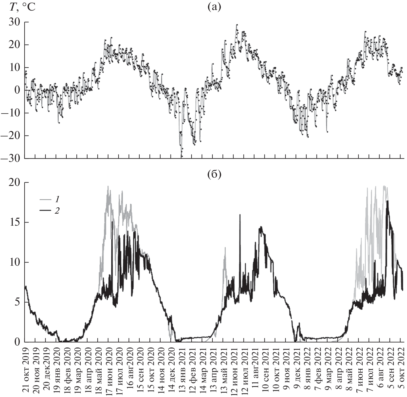 Based on year-round measurements of water temperature at an autonomous station (an anchored chain equipped with temperature sensors), the features of the temperature and ice regimes of the Petrozavodsk Bay of Onega Lake in modern climatic conditions were studied; the dates and duration of the main hydrological phenomena in the water area of the bay were specified. In the abnormally warm winter of 2019–2020, the water area of the Petrozavodsk Bay was not completely covered with ice for the first time in a long period of observations; in the area of the measurement station, ice fields were observed from late January to mid-March. The duration of ice-covered period in the next two winters was 3.5 and 5 months. Data were obtained on the timing of the onset and duration of the spring under-ice convection, a phenomenon that plays an important role in the thermal regime of the lake at the end of winter. It is shown that 2016, 2021 and 2022 spring under-ice convective mixing lasted 4–6.5 weeks, covering the entire water column by the end of ice period. Mixing of the water column after breaking the ice (spring homothermy) continued for another 3–4 weeks. In the spring of 2020, under-ice convection was not observed; spring overturn continued for two months from mid-March to mid-May. The dates of the upward transition of water temperature through 4°C in the years of measurements (5–19 May) were ahead of the long-term average by 2–3 weeks (end of May). Thermal stratification was established from 12 to 27 May and existed for 3–3.5 months. Complete mixing of the water mass of the bay took place in late August–early September, and then, until ice settling, the water column cooled in a state of homothermy. Immediately before ice formation, the water temperature dropped to very low values and did not exceed 0.1°С in the water column. The period with an average daily water temperature of the surface layer of the Petrozavodsk Bay above 10°C lasted from 121 to 144 days during the years of measurements.