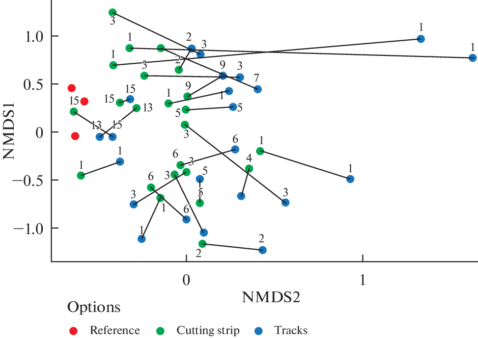 —The article presents materials for studying the physical properties of the upper horizons of the soil, the species diversity of the living ground cover and the natural regeneration of trees in 1–15 years old clear-cuttings. A noticeable compaction of the soil is observed in the ruts of the passage of machines, mainly in the thickness of the soil 0–10 cm, but not in the between ruts sand the cutting strips. We found that the physical properties (bulk density, total porosity and aeration porosity) of the upper soil horizons depend on the age of cutting and the study site (p < 0.01). Soil compaction in the ruts decreases 9–15 years after logging to indicators in sites where the movement of machines was not carried out. The overgrowth of damaged sections in clear-cuts occurred through ruderal species and species with wide ecological amplitudes to environmental factors. This overgrowth stabilised 15 years after logging when the biodiversity level approached untouched stands. The regeneration of clear-cuts is mainly deciduous such as birch and aspen that mainly grew in the cutting strips. In the ruts and the between ruts, the amount of undergrowth is 2–7 times less than in cutting strips.